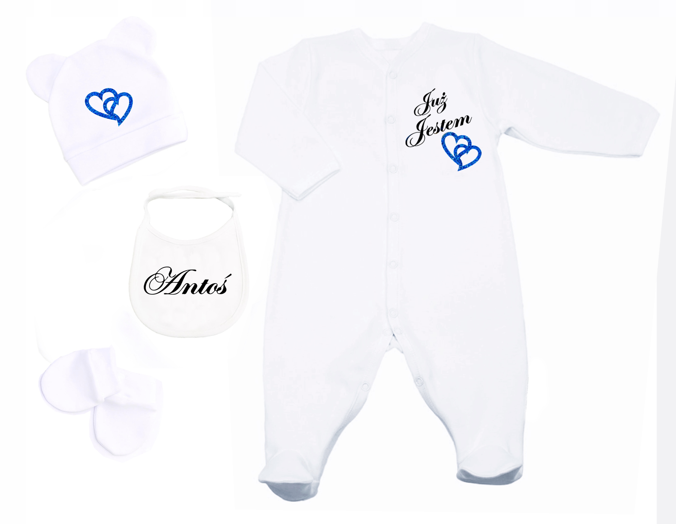 дуже зручний набір, зроблений з високої якості та приємного дотику бавовни. Pajacyk - це найзручніший одяг протягом перших тижнів життя дитини, саме тому вони є незамінним елементом першої митоти. Серця, зроблені з блакитного блиску.