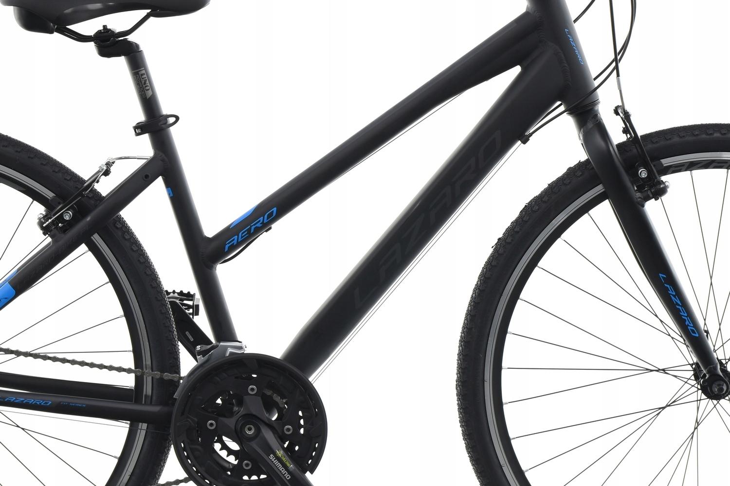 Серія велосипедів AERO – це комбінація кросового та шосейного велосипедів. Характеризується жорсткістю, спритністю і миттєвою реакцією на бажання прискоритися. Алюмінієва рама має можливість кріпити бризковики, стійку та пляшкову клітку за допомогою різьби. Великі алюмінієві колеса діаметром 28'' на масивних двокамерних дисках KANDS TECH (з високим конусом) і втулках LRO з картриджними підшипниками. Шини з дорожнім і гравійним протектором добре працюватимуть на асфальтованих поверхнях і бічних дорогах. Фірмові компоненти приводу від Shimano забезпечать тривалу та безвідмовну роботу та безпроблемне перемикання передач. Модель Aero орієнтована на людей, яким від велосипеда потрібен спортивний характер, міцність і універсальність. Положення користувача не таке лежаче, як на шосейному велосипеді, тому що аеронавігатор має піднятий винос і злегка профільоване кермо. Якщо ви шукаєте універсальне та легке обладнання з хорошою репутацією та дуже хорошим співвідношенням ціни та якості. Тоді велотренажер Lazaro – один із варіантів для вас.