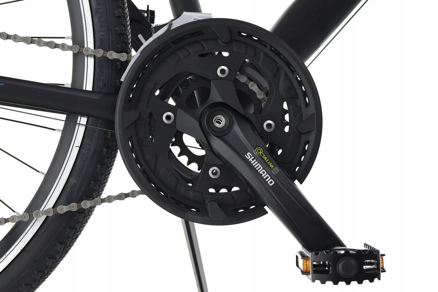 Надійний алюмінієвий шатун SHIMANO FC-TY4010 із довжиною плеча 175 мм. Оснащений трьома зірочками з числом зубів 48/36/26 для найнижчої зірочки, що забезпечує відповідну лінію роботи ланцюга. Призначений для приводів 3x9 і плавного та надійного перемикання передач на складній місцевості завдяки системі HyperDrive. Використана вставка Shimano Octalink. Для порівняння: потужність, що передається на 8-шліцеву вставку OCTALINK зі звичайними квадратними шліцями, збільшує жорсткість усієї конструкції.