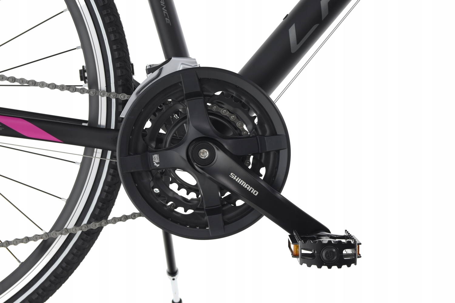 Надійний алюмінієвий шатун SHIMANO FC-TY501 із довжиною плеча 170 мм. Оснащений трьома зірочками з числом зубів 48/38/28 для найнижчої зірочки, що забезпечує відповідну лінію роботи ланцюга. Призначений для приводів 3x8 і плавного та надійного перемикання передач завдяки системі DUAL SIS. Зірочки, виготовлені за технологією HYPERGLIDE.