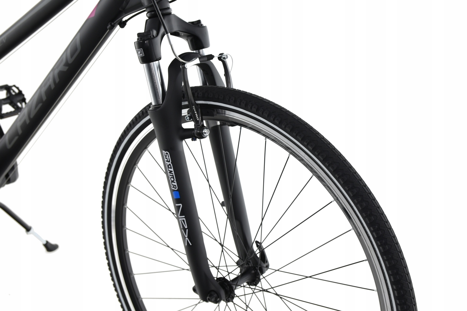 Вилка передня амортизація SR-SUNTOUR, модель NEX, з ходом 63 мм, з регульованою жорсткістю пружини. Гасить вібрацію та забезпечує високий комфорт водіння.