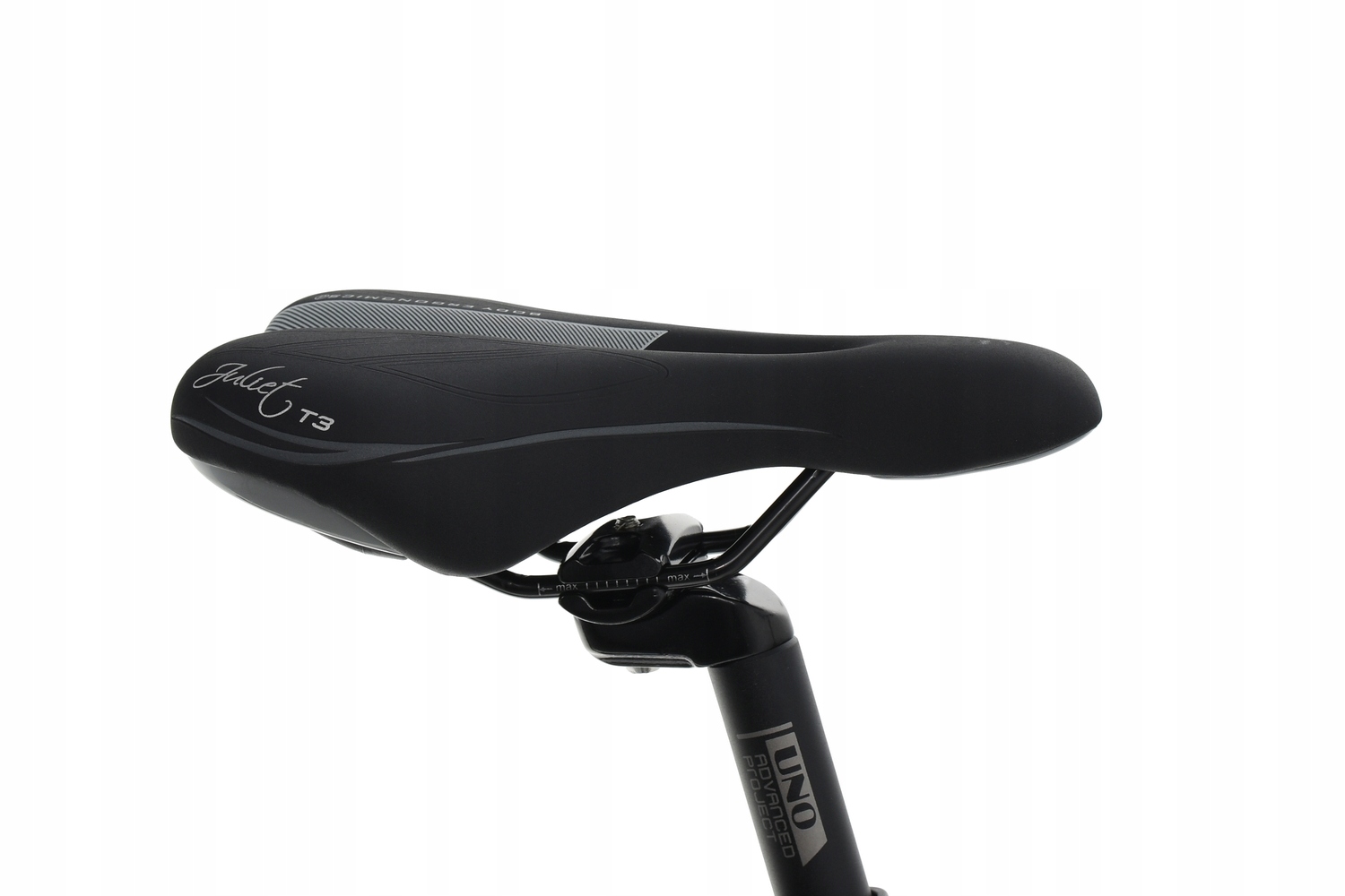 Зручне анатомічне сідло DDK. Кріпиться до алюмінієвого підсідельного штиря Kalloy Uno з інтегрованим хомутом, який дозволяє регулювати кут нахилу та положення сідла щодо керма.
