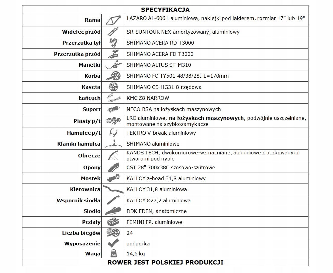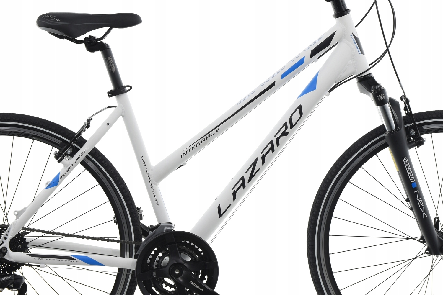 Lazaro Integral V2 Bike - це перехресна модель, тобто поєднання універсальності та геометрії походів та більш агресивного стилю гірських велосипедів. Ця модель дебютувала в 2009 році. Його оцінили широкий спектр задоволених велосипедистів. Це буде хорошим вибором для людей, які цінують універсалізм та зручність переміщення в міських умовах та поїздках за межі міста на польові маршрути. Легкий і міцний алюмінієвий каркас з геометрією, що дозволяє зайняти зручне положення. Великі алюмінієві колеса з діаметром 28 '', побудованими на суцільних двокамерних технологіях Kands (з високим конусом 25 мм!) Та маточиками LRO на машинних підшипниках. Шини з дорожнім протектором працюватимуть на загартованих поверхнях, а також на бічних дорогах. Рамка має нитки для встановлення аксесуарів, таких як крила, пляшка з водою, багажник. Компоненти фірмового приводу від Shimano забезпечать тривалий термін експлуатації та проблеми з проблемами та проблеми, що не містить проблеми. Ефективні гальма V-гальма дають відчуття безпеки та контролю під час подорожі. Якщо ви шукаєте універсальне обладнання з репутацією і, крім того, дуже хорошого коефіцієнта якості ціни, то Lazaro Cross Bike -одна з пропозицій для вас.