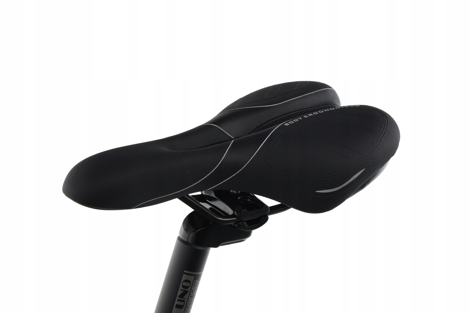 Зручне анатомічне сідло DDK. Кріпиться до алюмінієвого підсідельного штиря Kalloy Uno за допомогою вбудованого хомута, який дозволяє регулювати кут нахилу та переміщати сідло все ближче до керма.