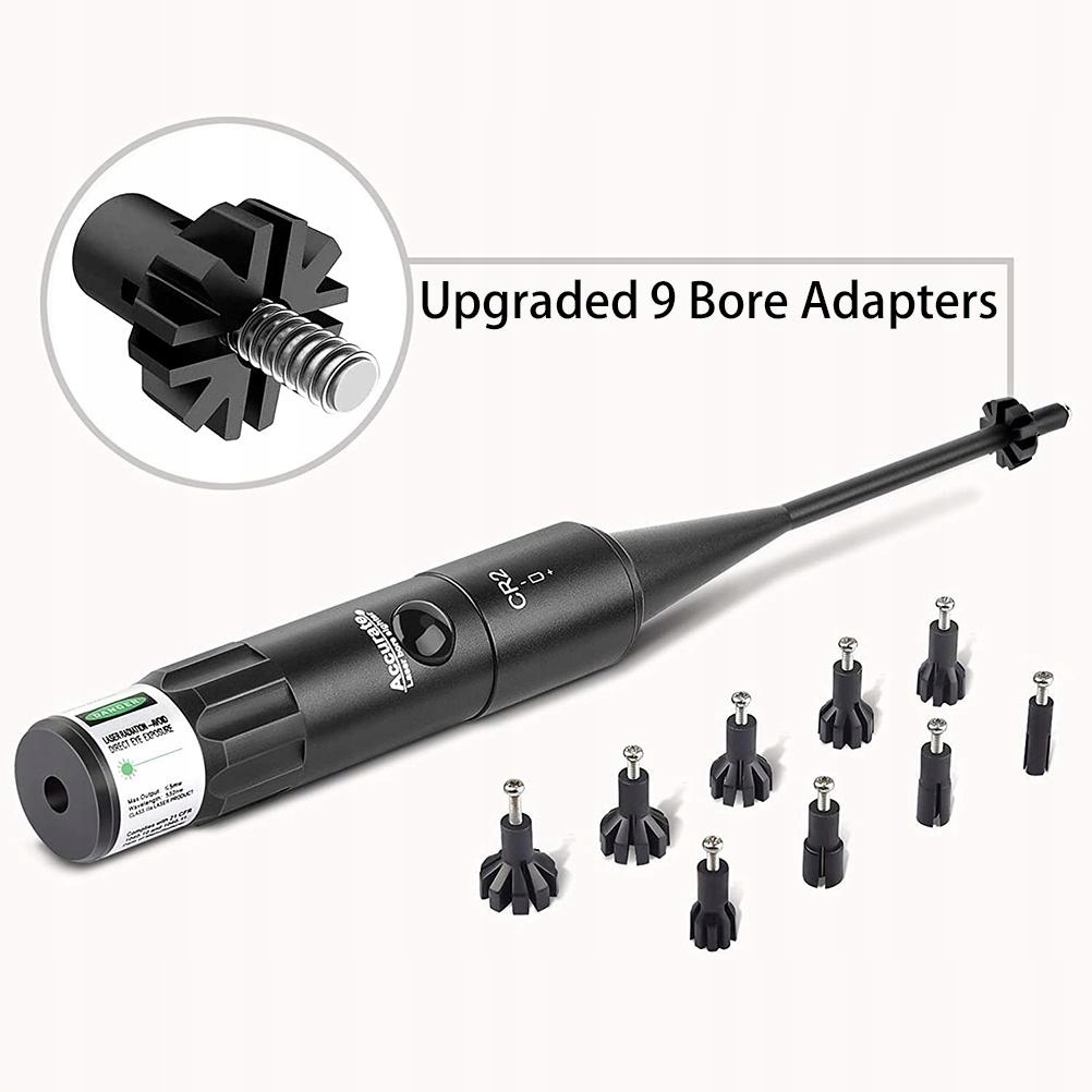 - Набір прицілів BoreSighter Green Sighter із великою кнопкою перемикання для калібру .177–.50 із 9 пластиковими жорсткими адаптерами для шарнірів