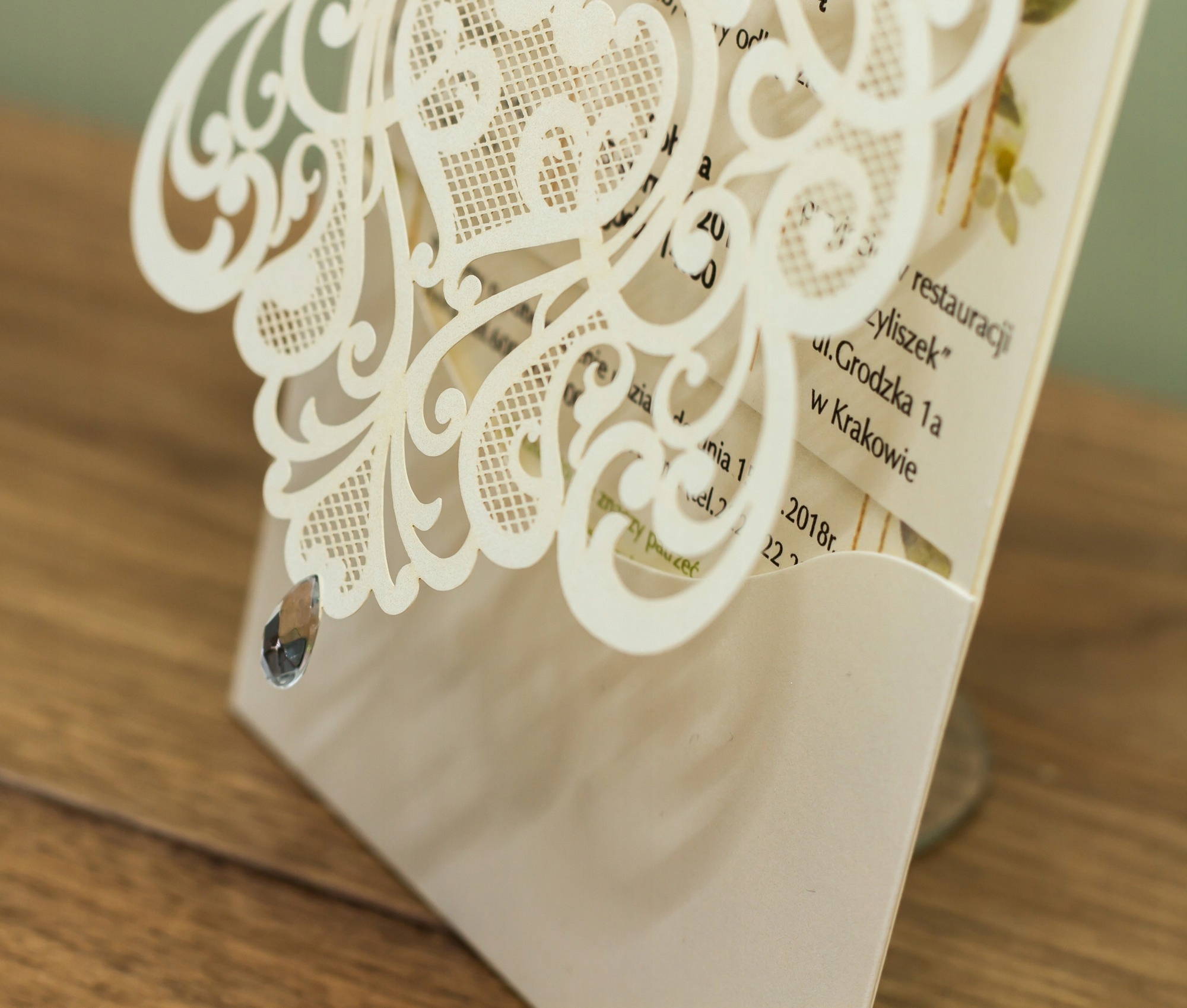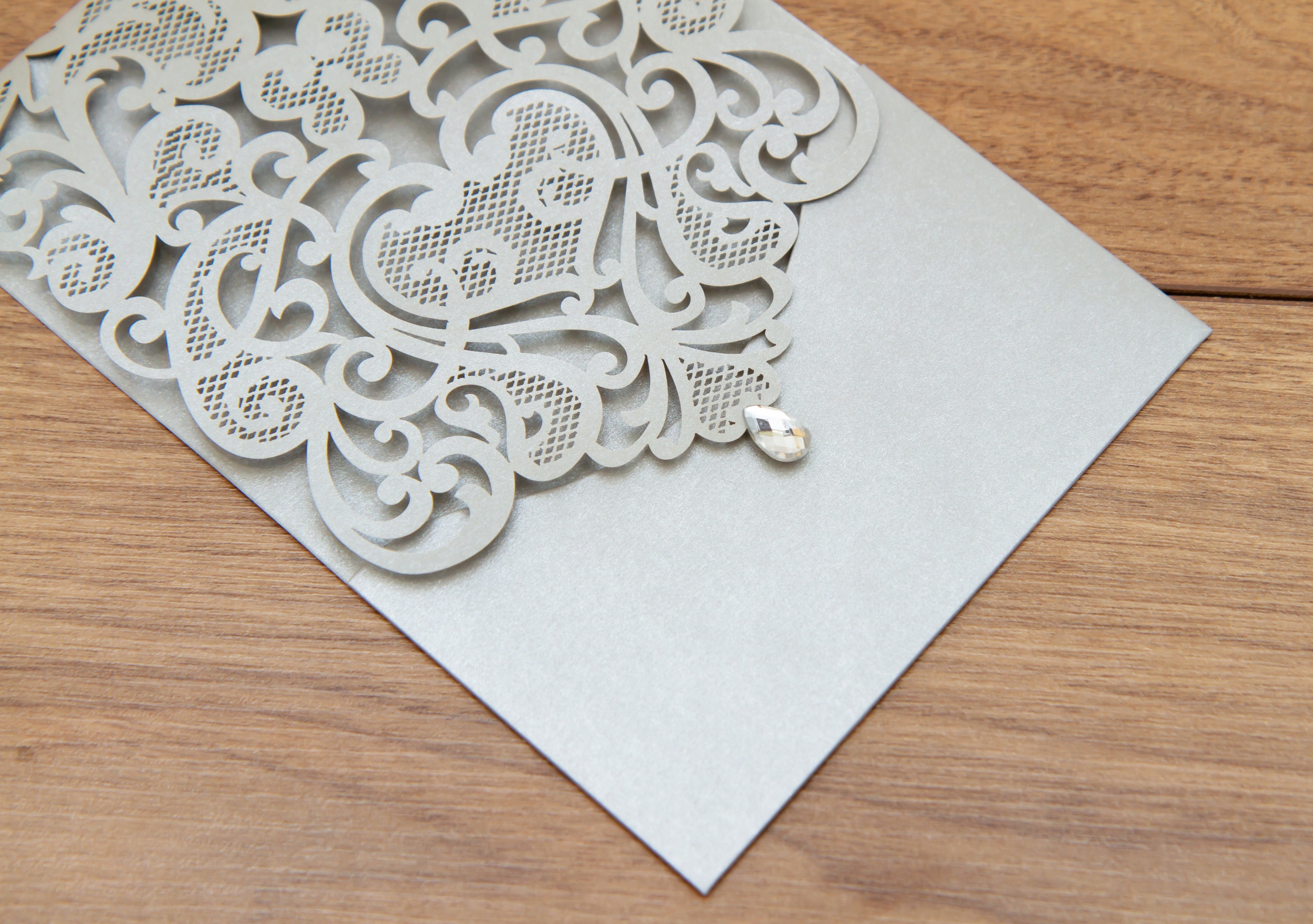 Унікальні запрошення, вирізані лазером, виготовлені з перламутрового паперу.