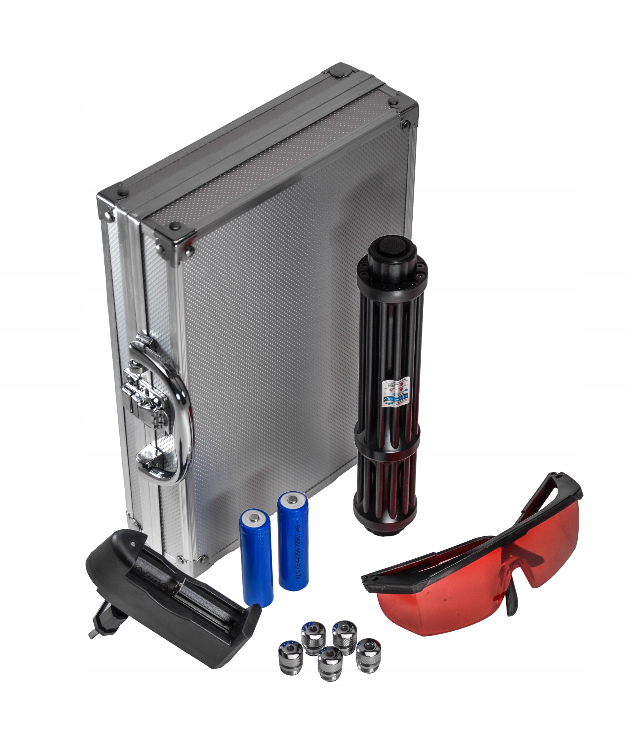 - Лазер живиться від двох загальнодоступних батарейок 18650 з напругою 3,7 В, які входять до комплекту