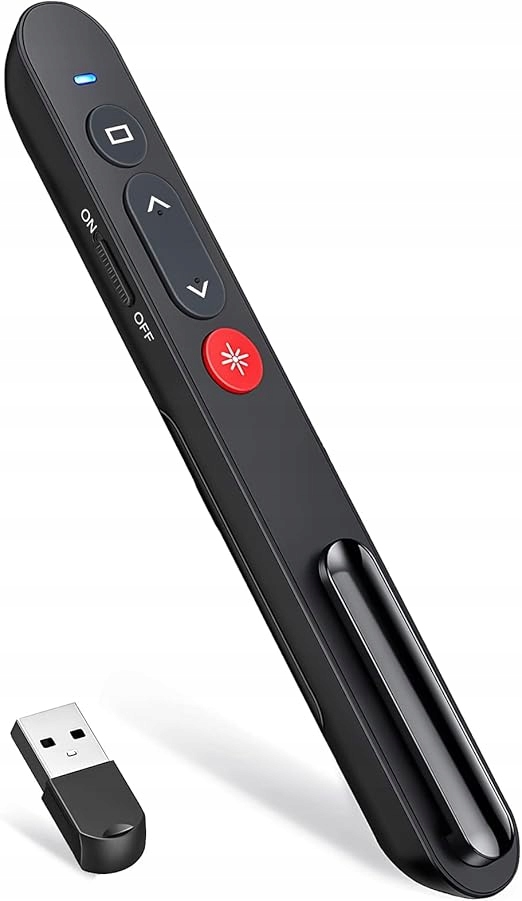 Оснащений: магнітним USB-приймачем, вбудованим у PowerPoint доповідача, щоб уникнути втрати. Просто вставте 1 батарею AAA в презентер і підключіть приймач до порту USB, встановлення програмного забезпечення не потрібно. Після презентації залиште USB-приймач у презентаторі.