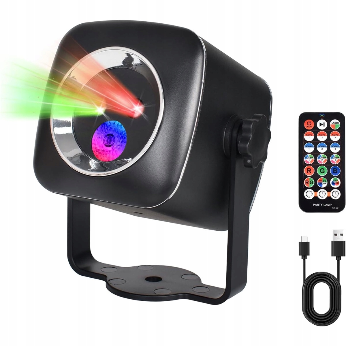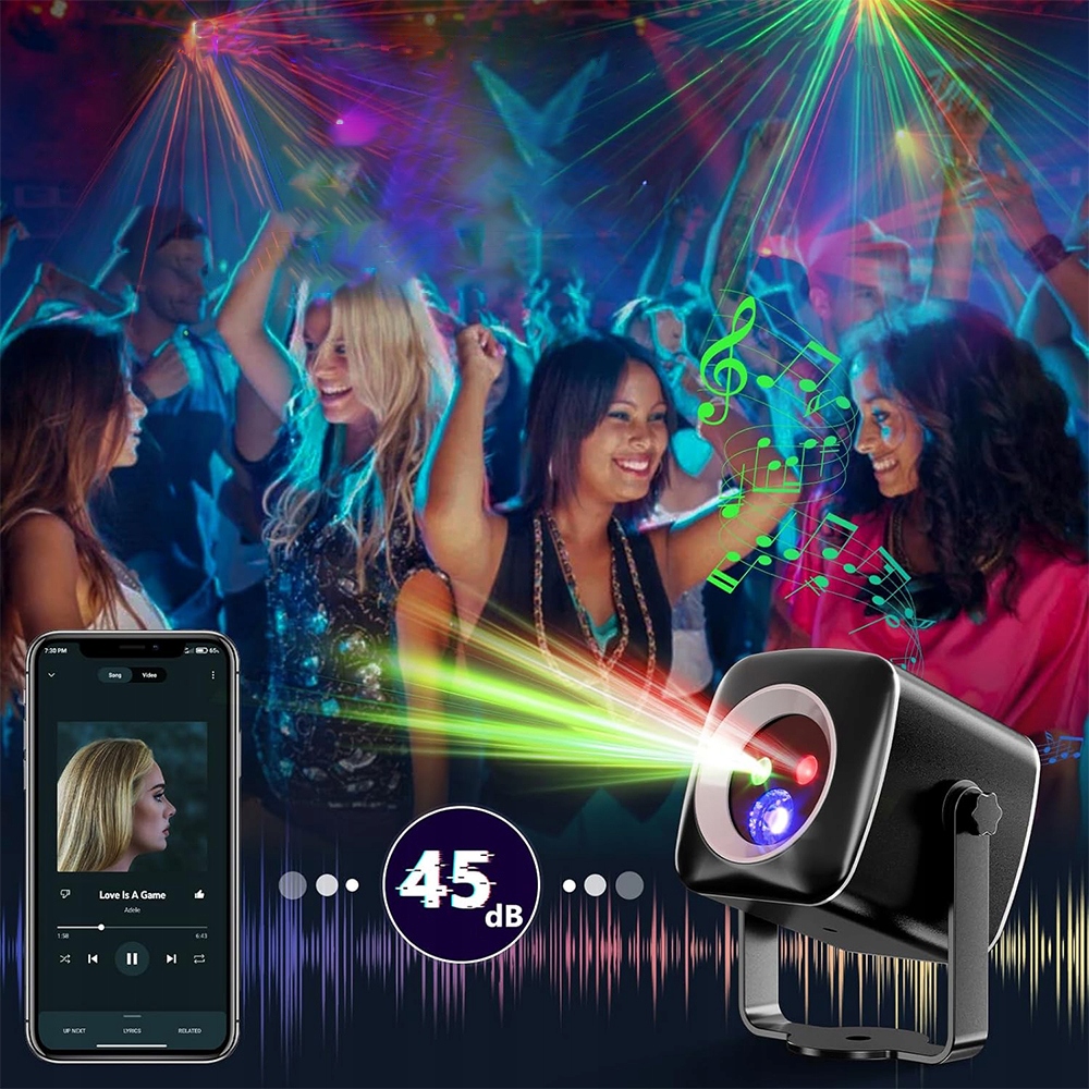 - Основні світильники диско -кулі червоні та зелені, а світлодіоди на задньому плані червоні, зелені та сині. Пропонує 60 різних конструкцій та 9 режимів (автоматичний режим 1/2/3, спалах 1/2/3, музичний режим 1/2/3).