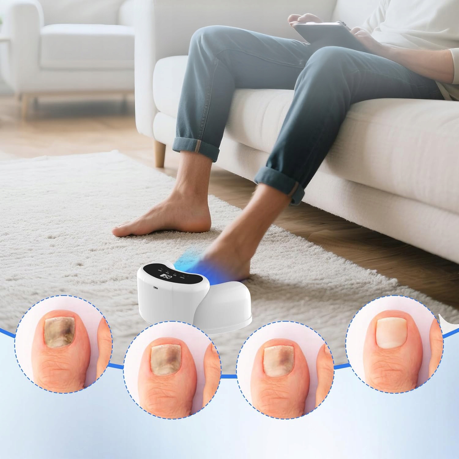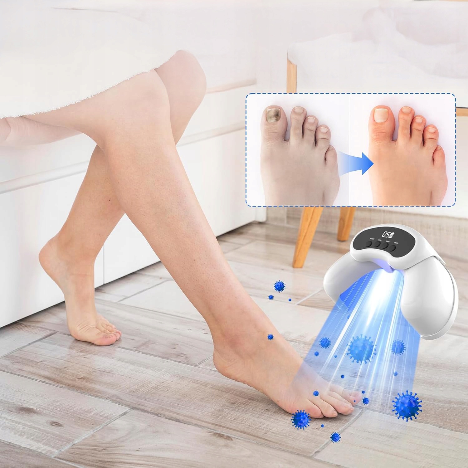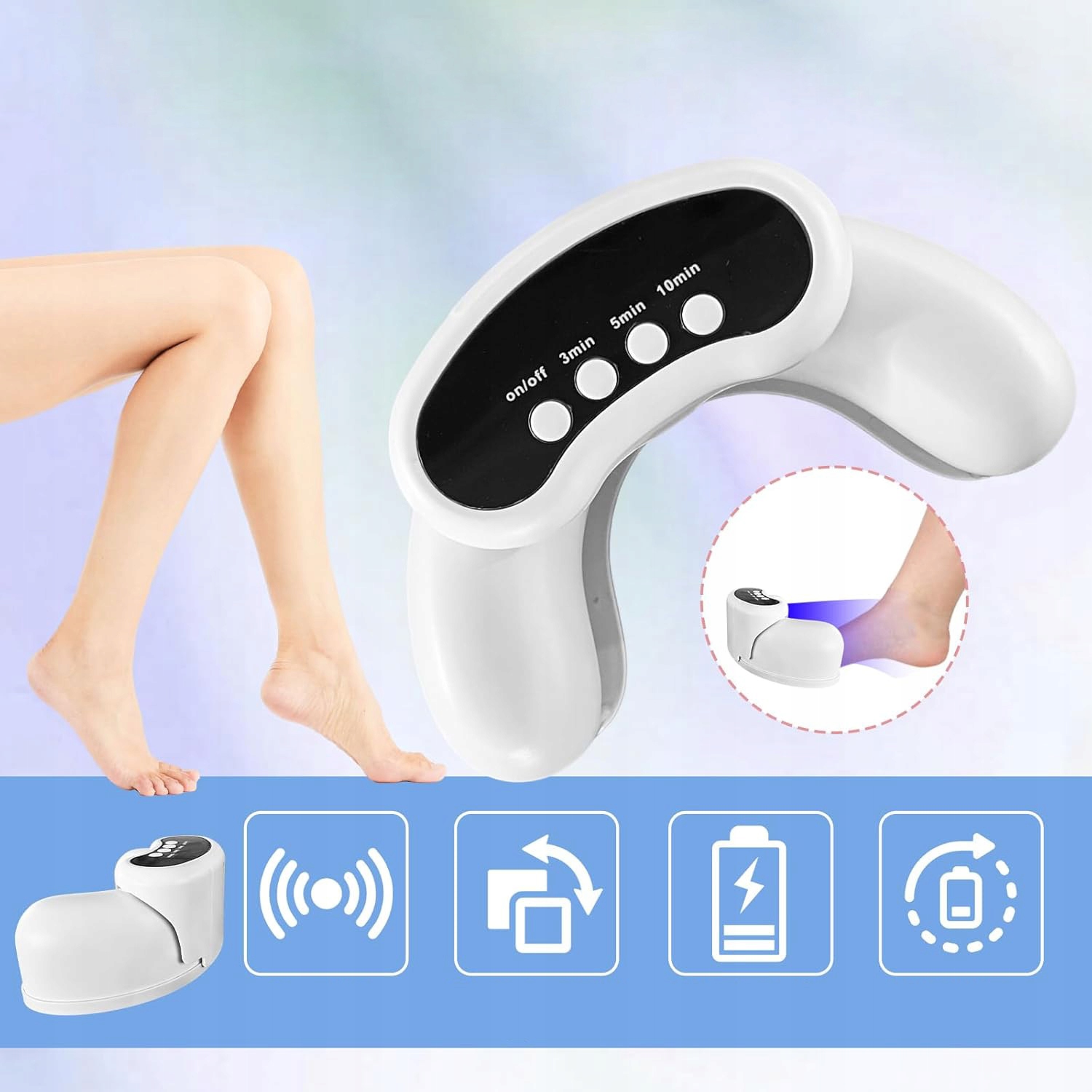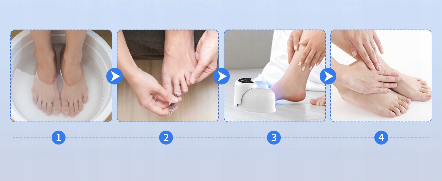 - ✅- Доступні три додаткові процедури (3 хвилини, 5 хвилин і 10 хвилин). Перед використанням вимийте руки та ноги та підстрижіть нігті до потрібної довжини. Після вибору потрібного часу лікування автоматично розпочнеться зворотний відлік, що зробить лікування легшим і приємнішим.