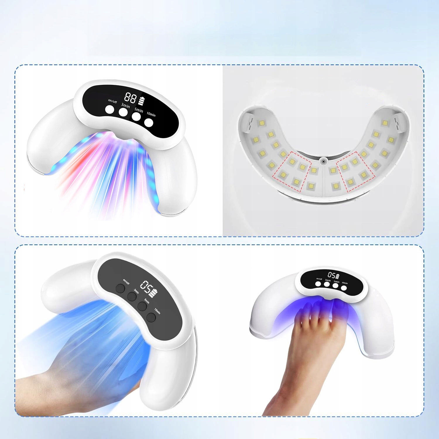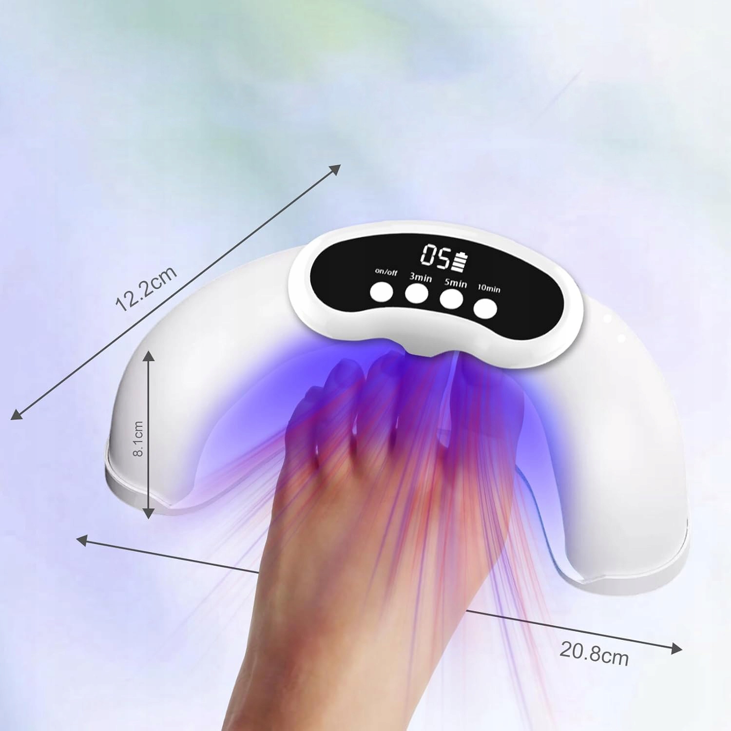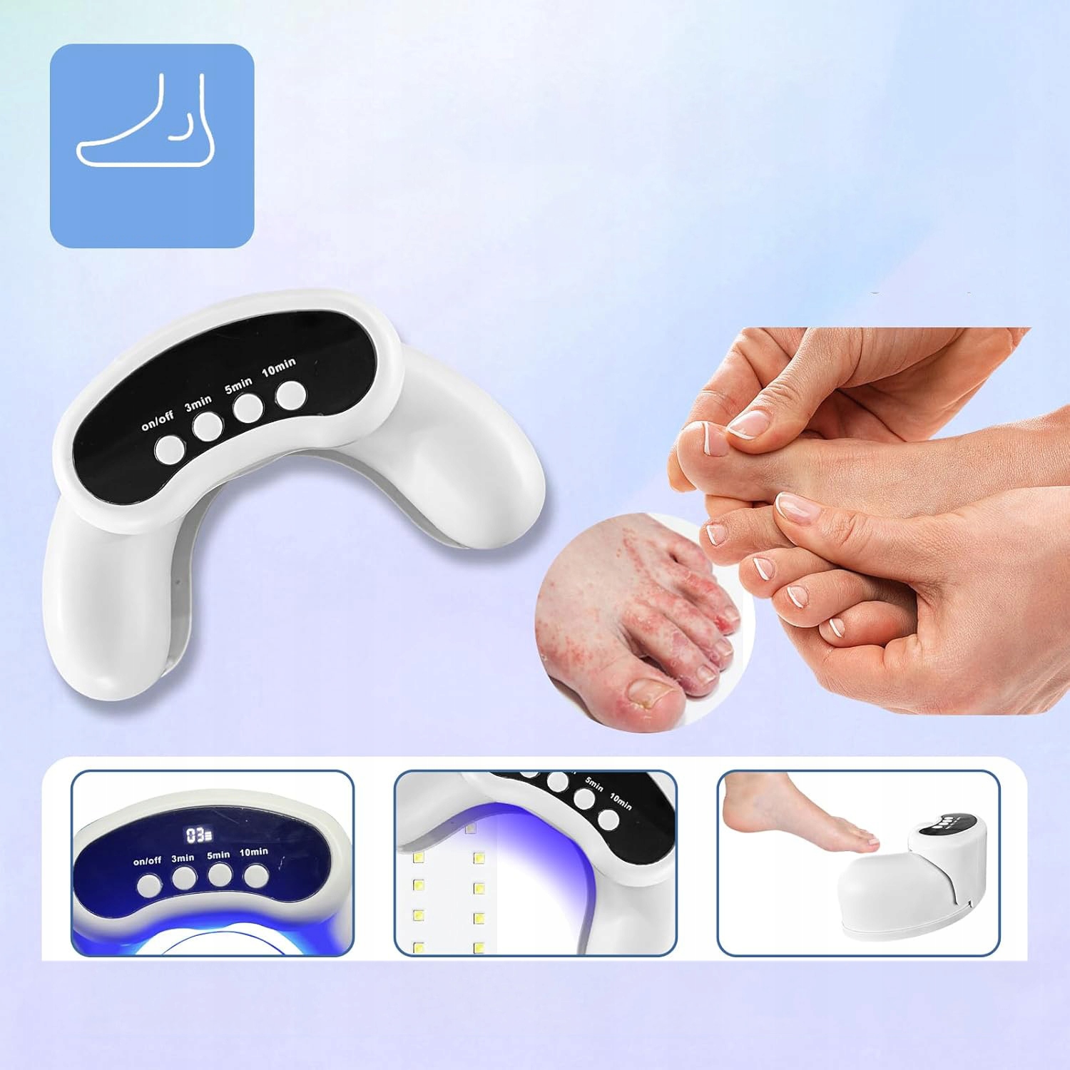 пристрій має 3 години роботи на вибір (3, 5, 10 хвилин); ви можете легко та безпечно використовувати його вдома. Перед використанням вимийте руки або ноги та підстрижіть нігті до потрібної довжини. Помістіть пальці рук або ніг у відповідні отвори на пристрої та виберіть потрібний час. Розпочнеться зворотній відлік.