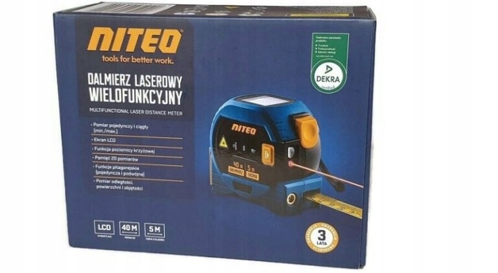 Багатофункціональний лазерний далекомір NITEO з РК-екраном задовольнить вимоги кожного ентузіаста DIY. Лазерний далекомір - незамінний прилад для ремонтних, оздоблювальних і монтажних робіт. Численні функції далекоміра дозволяють вимірювати відстань, площу та об'єм. Вбудований РК-екран дозволяє легко зчитувати результат вимірювання, а п’ятиметрова рулетка ідеально підходить для вимірювання відстані вручну.