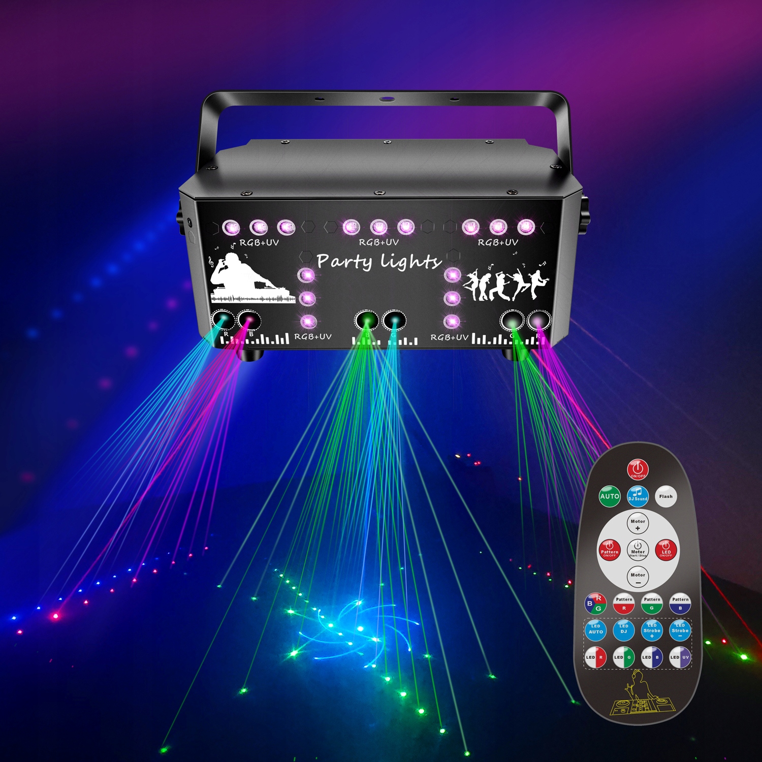 - Ефект: лазер 64 візерунки + червоний, зелений і синій світлодіодний фоновий барвник + ефект чорного ультрафіолетового світла