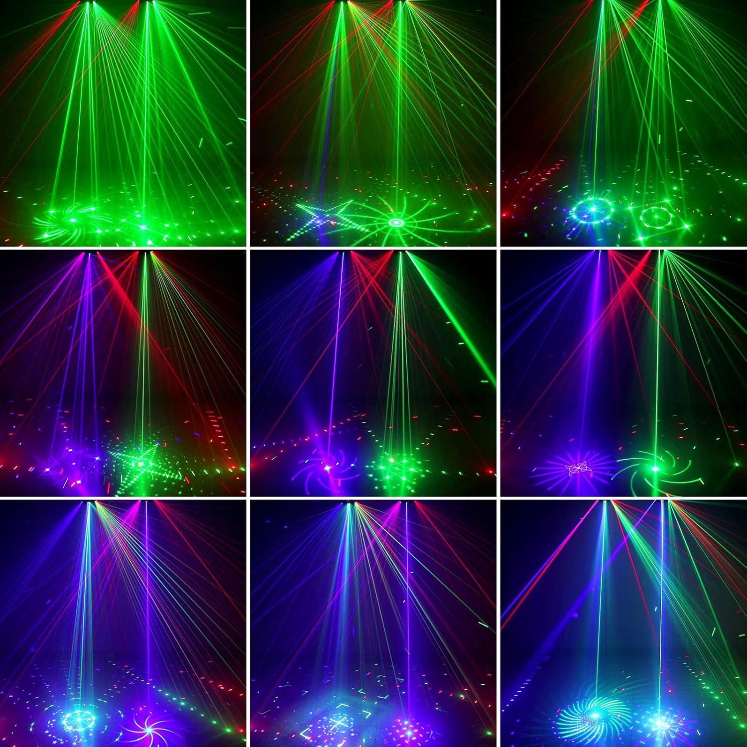 - Ефект: 64 візерунки лазера + червоний, зелений і синій світлодіодний фоновий барвник + ефект чорного ультрафіолетового світла