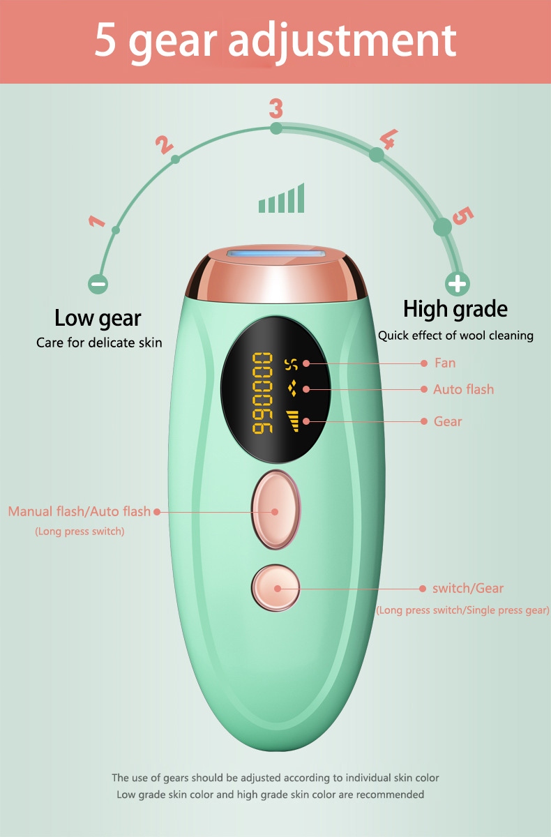 В епіляторі IPL використовується професійна технологія IPL (інтенсивне імпульсне світло), яка може впливати безпосередньо на волосяну цибулину (без заважаючого джерела світла). Він нагріває волосяні фолікули, фокусує світлову енергію на коренях, поглинає меланін і гальмує ріст волосся.