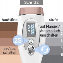 П'ять програмованих рівнів інтенсивності світла адаптуються до всіх типів шкіри. Два режими роботи: ручний для точної депіляції зони бікіні та обличчя, автоматичний для великих ділянок, таких як ноги або спина.