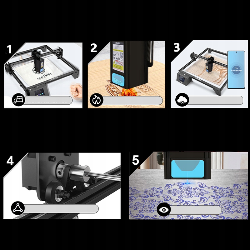 Один комп’ютер може керувати декількома лазерними гравірувальними машинами Ray5, що працюють, незалежно від того, чи це Ray5 5W, Ray5 10W або Ray5 20W, і підвищувати ефективність виробництва.