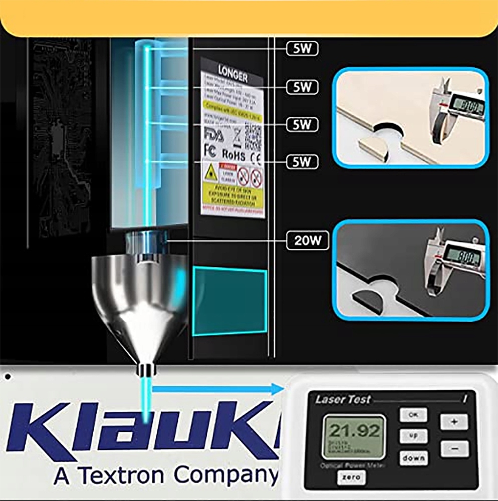 Потужне різання потужністю 20 Вт дозволяє за один прохід розрізати соснову деревину товщиною 0,59 дюйма/15 мм і акрил товщиною 0,31 дюйма/8 мм, навіть нержавіючу сталь товщиною 0,002 дюйма/0,05 мм