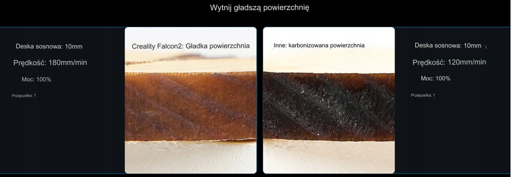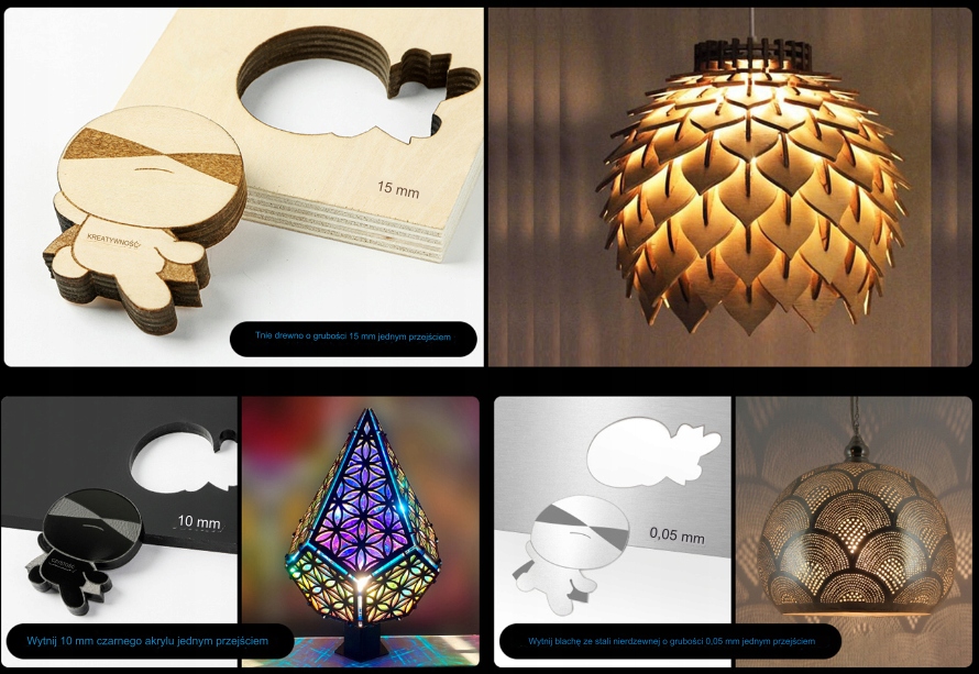 - Можна вирізати деревину 20мм за один прохід, 30 мм чорний акрил за один прохід і 0,15 мм лист з нержавіючої сталі за один прохід