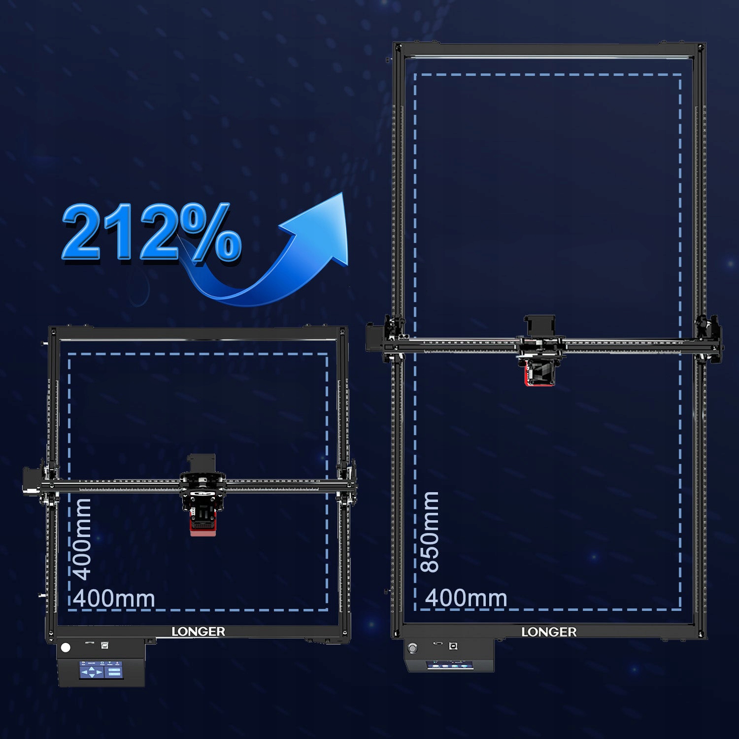 Завдяки технології подвійного променя, максимальна швидкість гравірування становить 10 000 мм/хв, вона здатна вирізати дерев’яну дошку на 0,8 -дюйм/20 мм акрилову дошку та 1,2 -дюймовий акрил/30 мм. Завдяки робочій зоні 400 * 400 мм можна одночасно виконувати більше операцій.