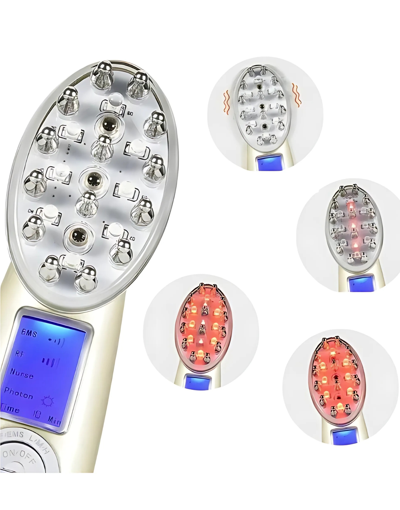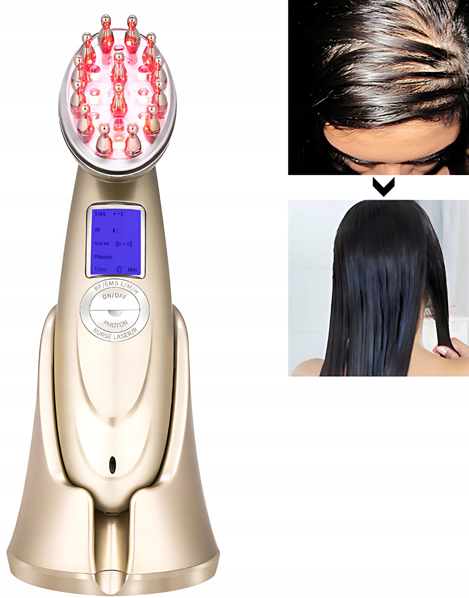 Червоний лазер стимулює лампочки до росту , EMS зміцнює м’язи шкіри голови , а RF покращує тканину та харчування шкіру . Регулярне використання - 3-4 рази на тиждень протягом 10 хвилин - дає видимі результати через кілька тижнів.