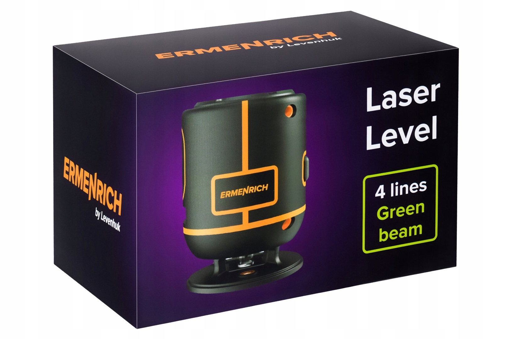 Ermenrich LN20 — лазерний рівень із самовирівнюванням, який створює чотири зелені лінії в горизонтальній площині. Кут проекції в горизонтальній площині - повні 360°. Інструмент ідеально підходить для будівельних і ремонтних робіт, а також для установки приладів і освітлення.