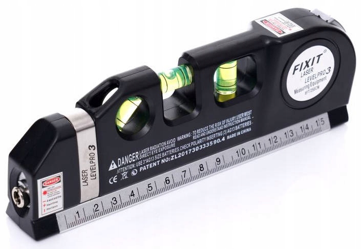 - Він має вбудований лазер із 3 режимами визначення: вертикальний, горизонтальні або обидва. Діапазон лінії, що відображається лазером, може досягати 5 метрів. Він живиться від 3 батарейок AG13.