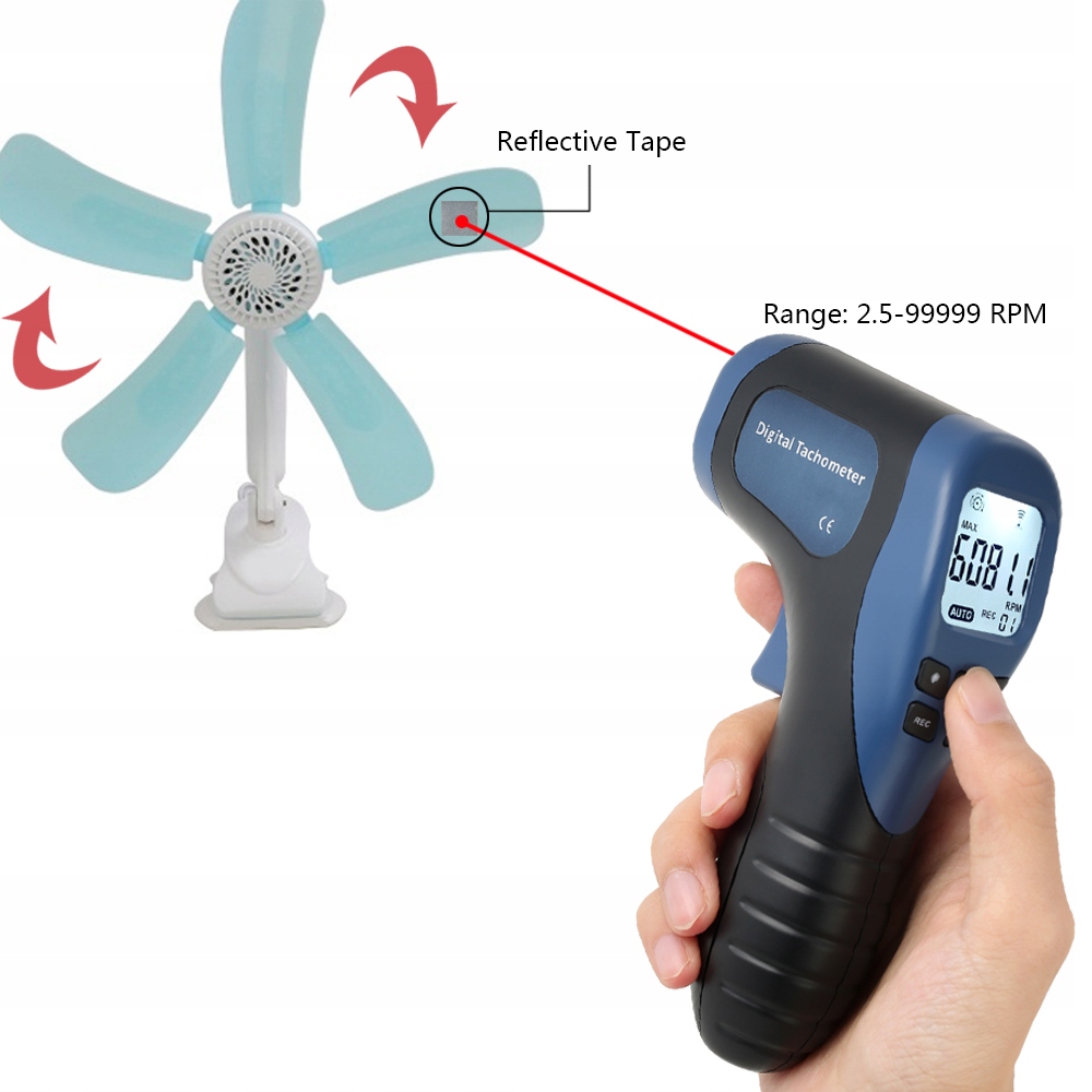 Цей тахометр є високоякісним пристроєм для вимірювання обертання в хвилину (об/хв) з широким вимірюванням та діапазоном високої роздільної здатності. Він характеризується високою точністю вимірювання, коротким часом вимірювання та великою відстані виявлення до 500 мм (20 дюймів) за допомогою лазера. Цей тахометр дуже простий у використанні, застосувавши світловідбиваючу стрічку (прикріплений до упаковки) до цільового об'єкта, а потім націліться на знак лазерним променем. Цей тахометр має широкий спектр застосувань, таких як вимірювання швидкості обертання машини, двигуни, колеса, токарний верстат для різання металу або деревини тощо.