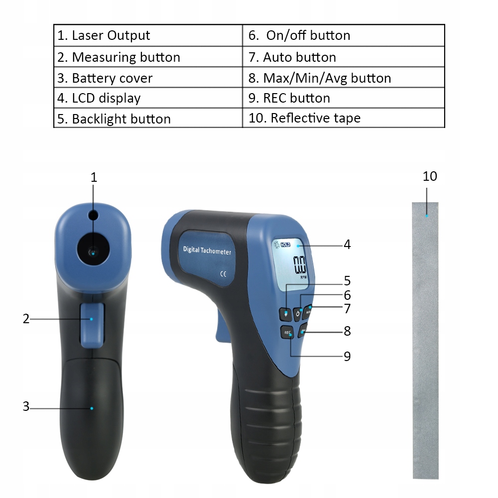 Цей тахометр є високоякісним пристроєм для вимірювання обертання в хвилину (об/хв) з широким вимірюванням та діапазоном високої роздільної здатності. Він характеризується високою точністю вимірювання, коротким часом вимірювання та великою відстані виявлення до 500 мм (20 дюймів) за допомогою лазера. Цей тахометр дуже простий у використанні, застосувавши світловідбиваючу стрічку (прикріплений до упаковки) до цільового об'єкта, а потім націліться на знак лазерним променем. Цей тахометр має широкий спектр застосувань, таких як вимірювання швидкості обертання машини, двигуни, колеса, токарний верстат для різання металу або деревини тощо.