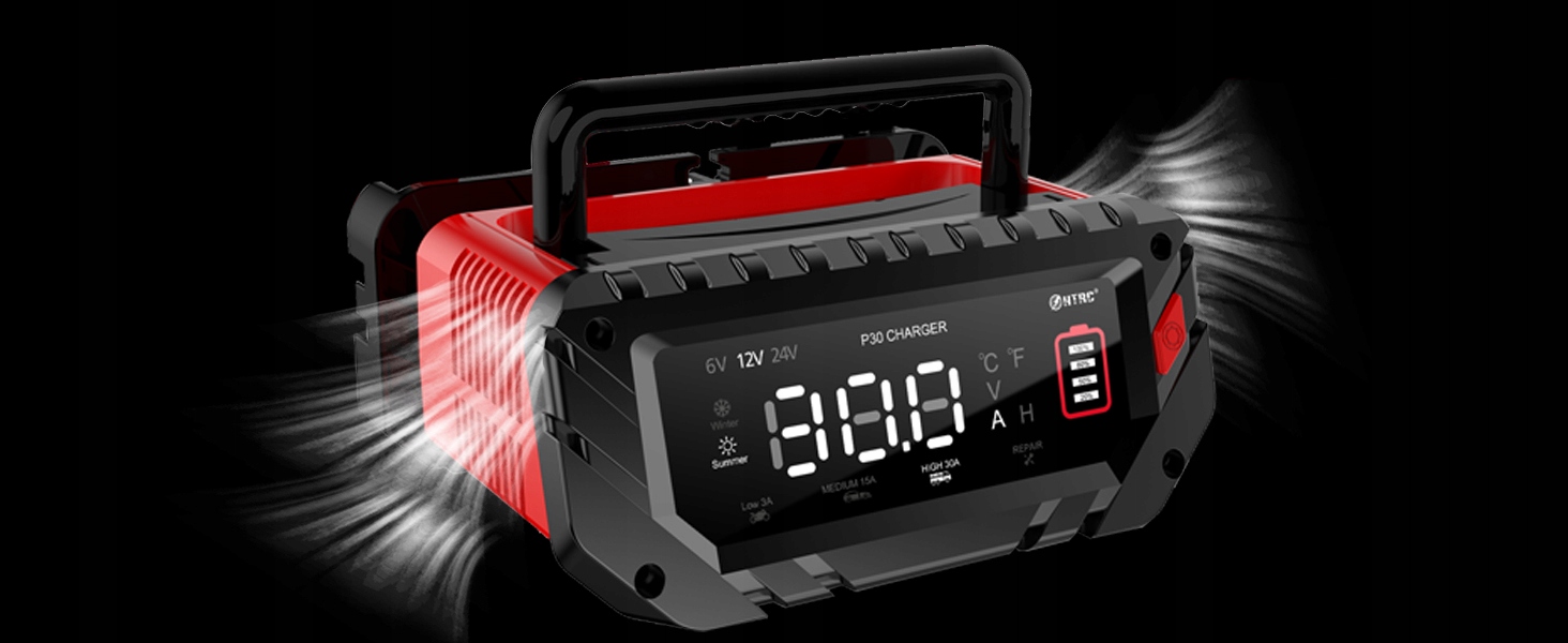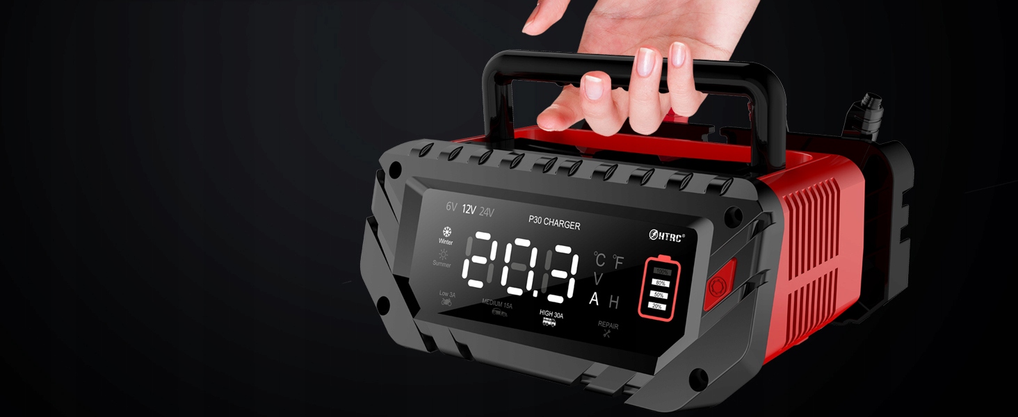 ?А кнопка «Пуск»?Зарядний пристрій 6 В/12 В/24 В автоматично визначає напругу батареї та може перемикатися між 4 разами завантаження одним натисканням кнопки. Завдяки РК-екрану напруга батареї відображає зарядний струм, температуру заряджання, заповнений акумулятор тощо. Зарядний акумулятор автоматично регулює зарядну ємність відповідно до температури навколишнього середовища.