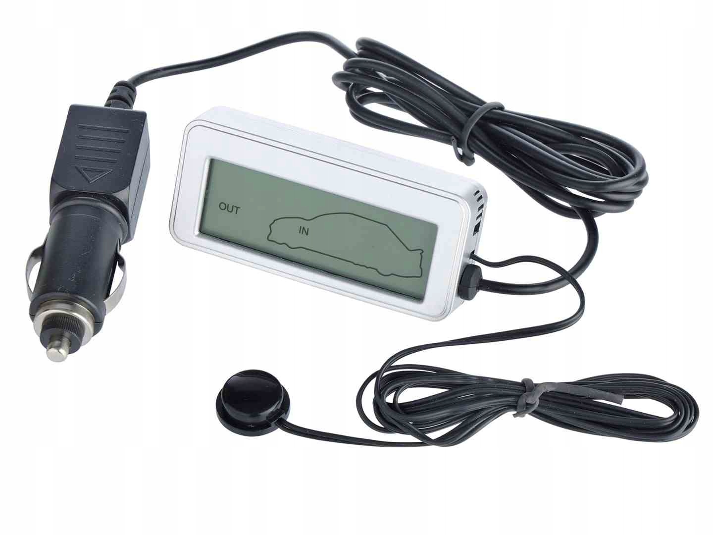 Електронний термометр автомобіля з РК -дисплеєм. Це дозволяє вимірювати зовнішню та внутрішню температуру за допомогою двох незалежних датчиків температури. Працює з більш легкої розетки.