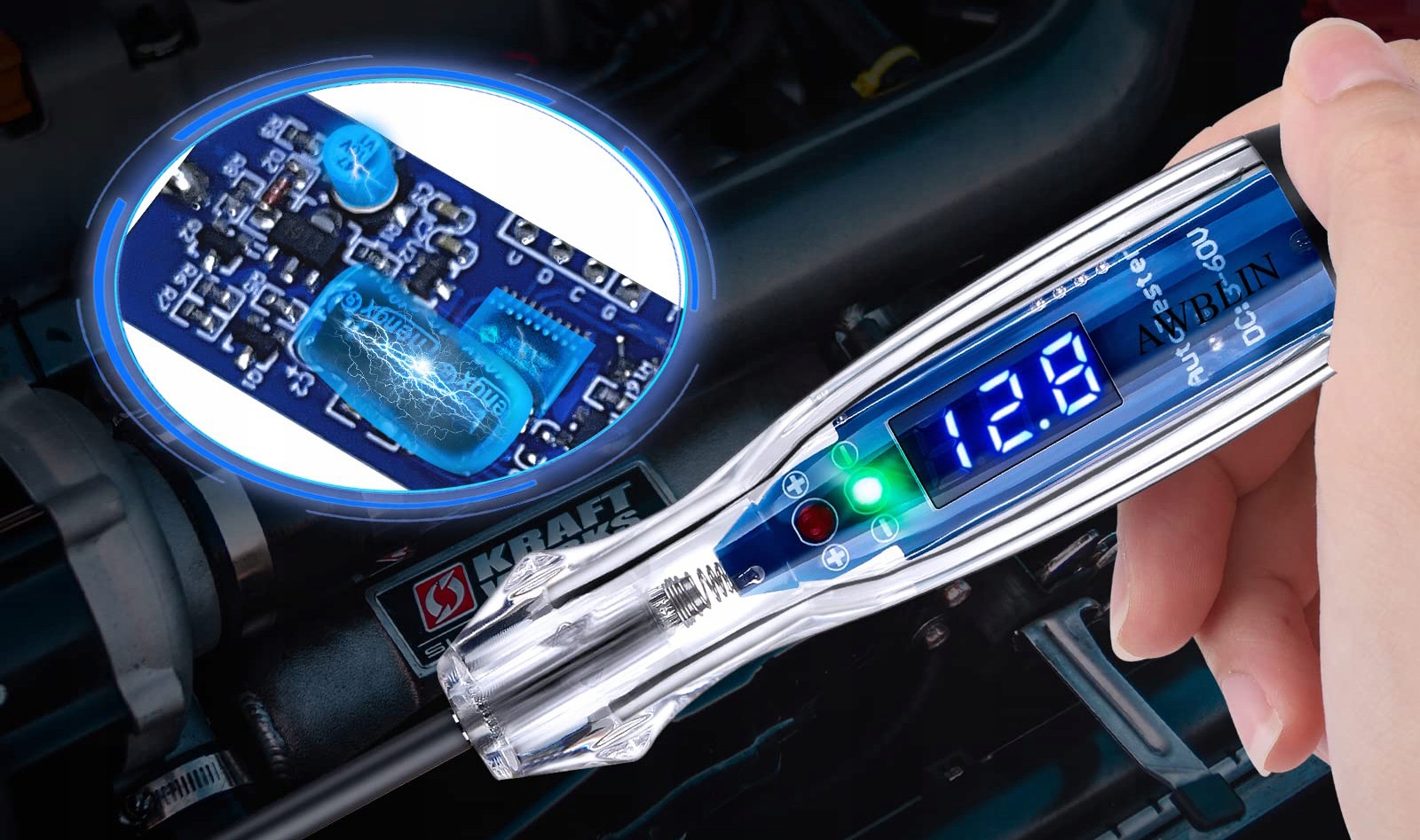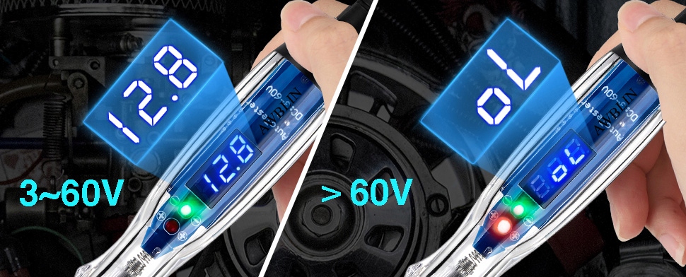 Діапазон випробувань 3-60 В ідеально підходить для перевірки напруги електричних ланцюгів в автомобілях, вантажівках і різних транспортних засобах, а також для автомобільних акумуляторів, системи заряджання, акумулятори, системи запалювання, які є важливим інструментом для будь-якого автомобільного інженера, інженера-електронника чи майстра схем.