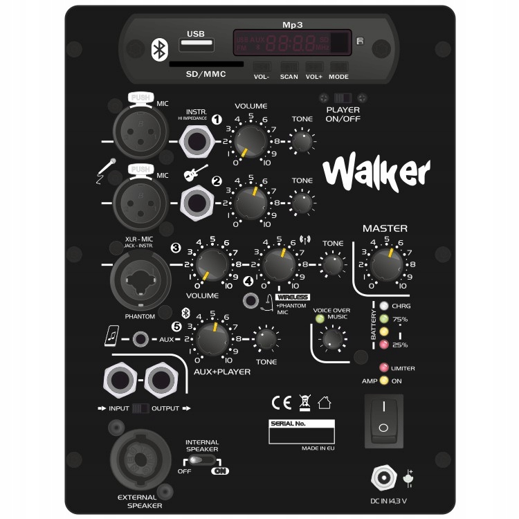 - Входи: мікрофонний/лінійний: (XLR-JACK) x1, мікрофонний x2, AUX x1, лінійний вхід: (Джек) x2;