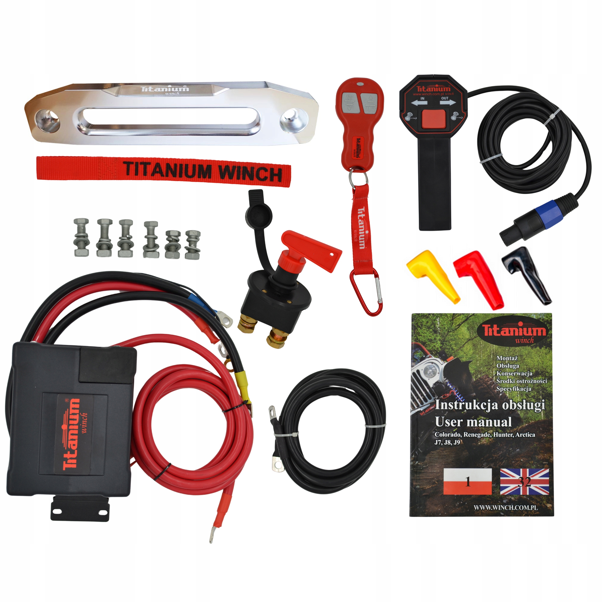 В набір входить все необхідне для складання та підключення лебідки. Контролер, кабелі, гвинти і навіть головний вимикач. Головний вимикач є дуже важливим елементом монтажу підключення лебідки, ми одні з небагатьох, хто додає його в комплект.