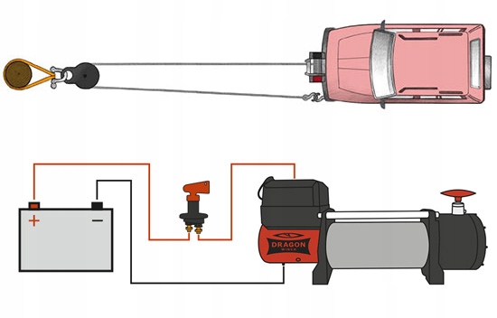 Цей комплект дозволяє подвоїти тягову силу вашої лебідки, як показано на ілюстрації. Це також буде корисно, коли ми хочемо надати інший напрямок волосіні, яка намотується на барабан під великим кутом.