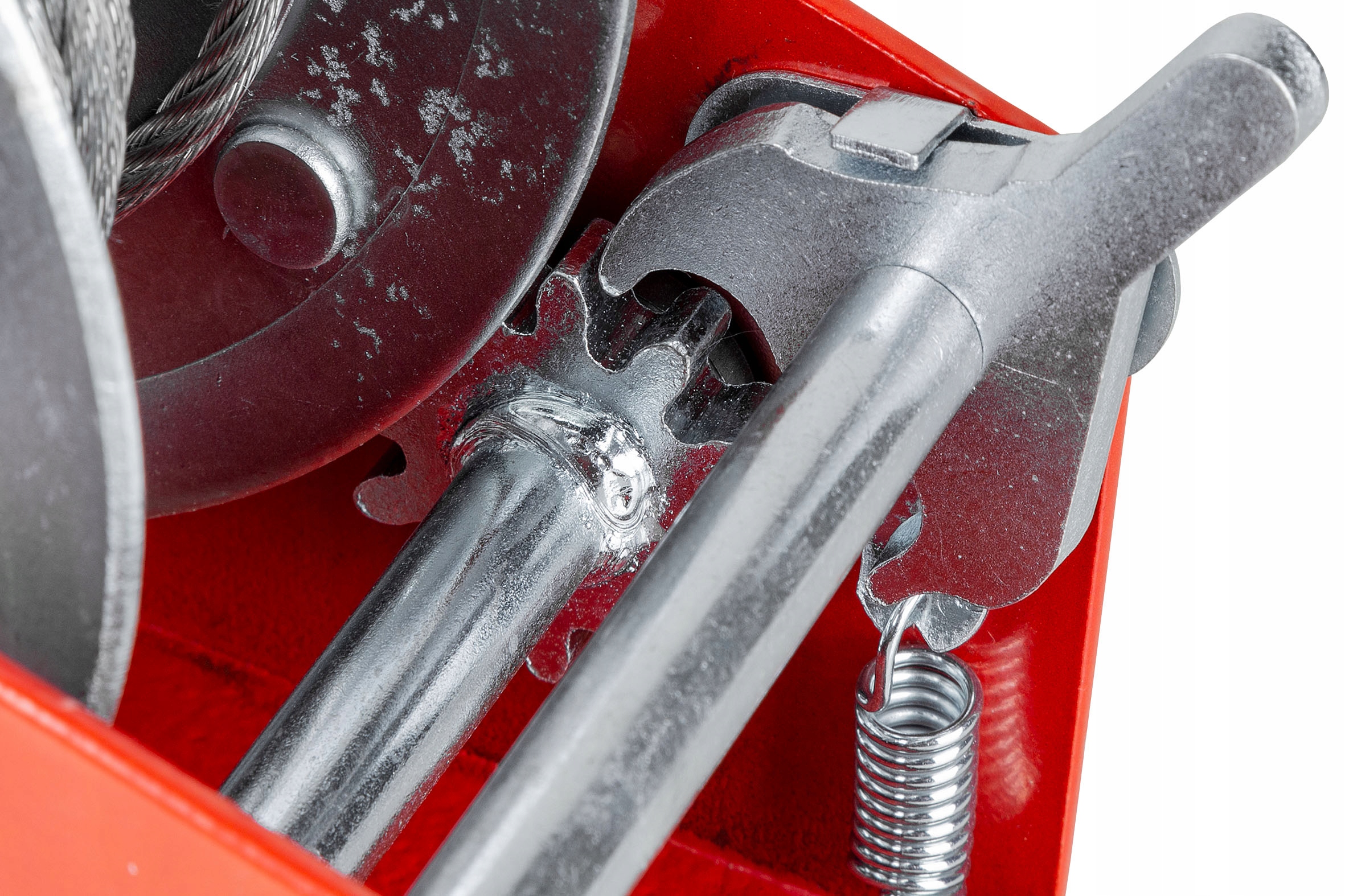 Безпека під час роботи забезпечується міцним храповим механізмом і потовщеним, посиленим зубчастим колесом. Це рішення гарантує високу жорсткість в цілому, а також високу надійність структура. Завдяки використанню рухомої двосторонньої собачки ми можемо легко як втягувати шестерню за допомогою механізму, так і плавно опускати по одному зубу рейки. Крім того, перемикач можна встановити в розблоковане положення, що дозволяє користувачеві вільно маневрувати мотузкою. Це робить роботу комфортною, ефективною та безпечною.