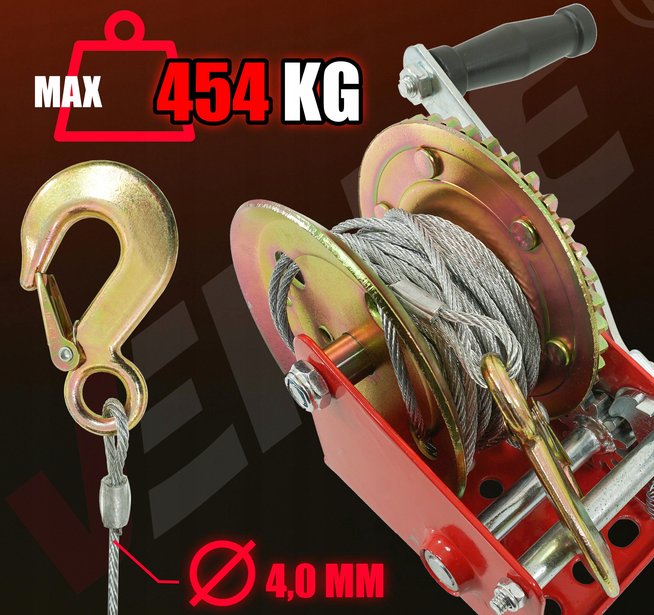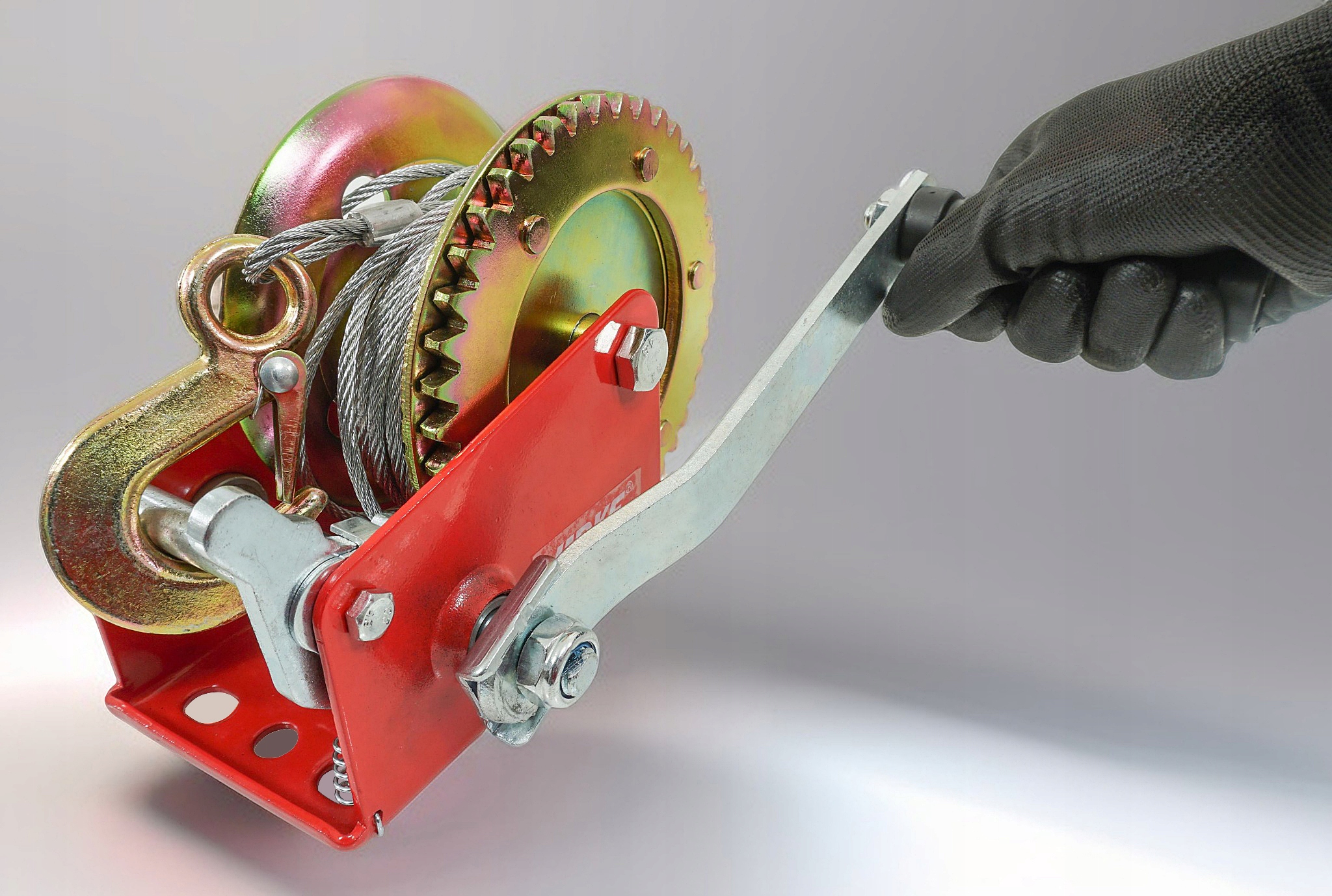 Це лебідка з міцною сталевою конструкцією, призначена для буксування невеликих човнів, водних мотоциклів, квадроциклів, невеликих транспортних засобів тощо. Має легкодоступний важіль для зміни напрямку обертання: змотування/розмотування. Лебідка виготовлена з високоякісних матеріалів з відповідною міцністю - конструкційна сталь і литий гак з поворотною пружиною. Пристрій управляється рукояткою разом із храповим механізмом, ці властивості дозволяють піднімати та опускати предмети. Його можна використовувати, зокрема, для розтягування сітки огорожі, прив’язування, кріплення та перетягування важких і великих предметів.