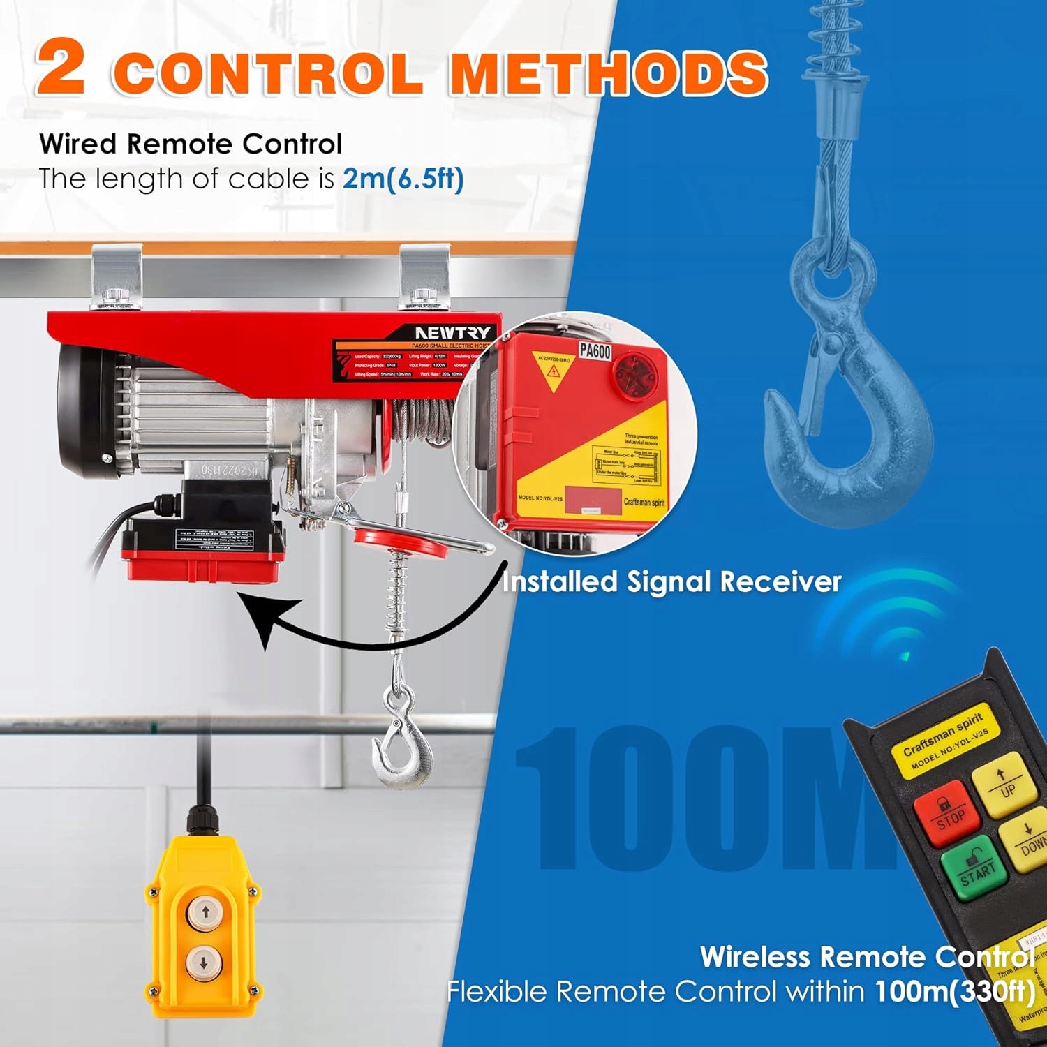 - [2 методи керування] Високочутливий бездротовий пульт дистанційного керування на радіусі 330 футів/100 м із простою в управлінні панеллю, що живиться від стандартних батарей AAA*2, допомагає гнучко керувати лебідкою на відстані. Стабільний пульт дистанційного керування з діапазоном 6,5 футів/2 м, уникає перешкод, спричинених навколишніми сигналами. Для більшої кількості робочих ситуацій доступні 2 методи керування.