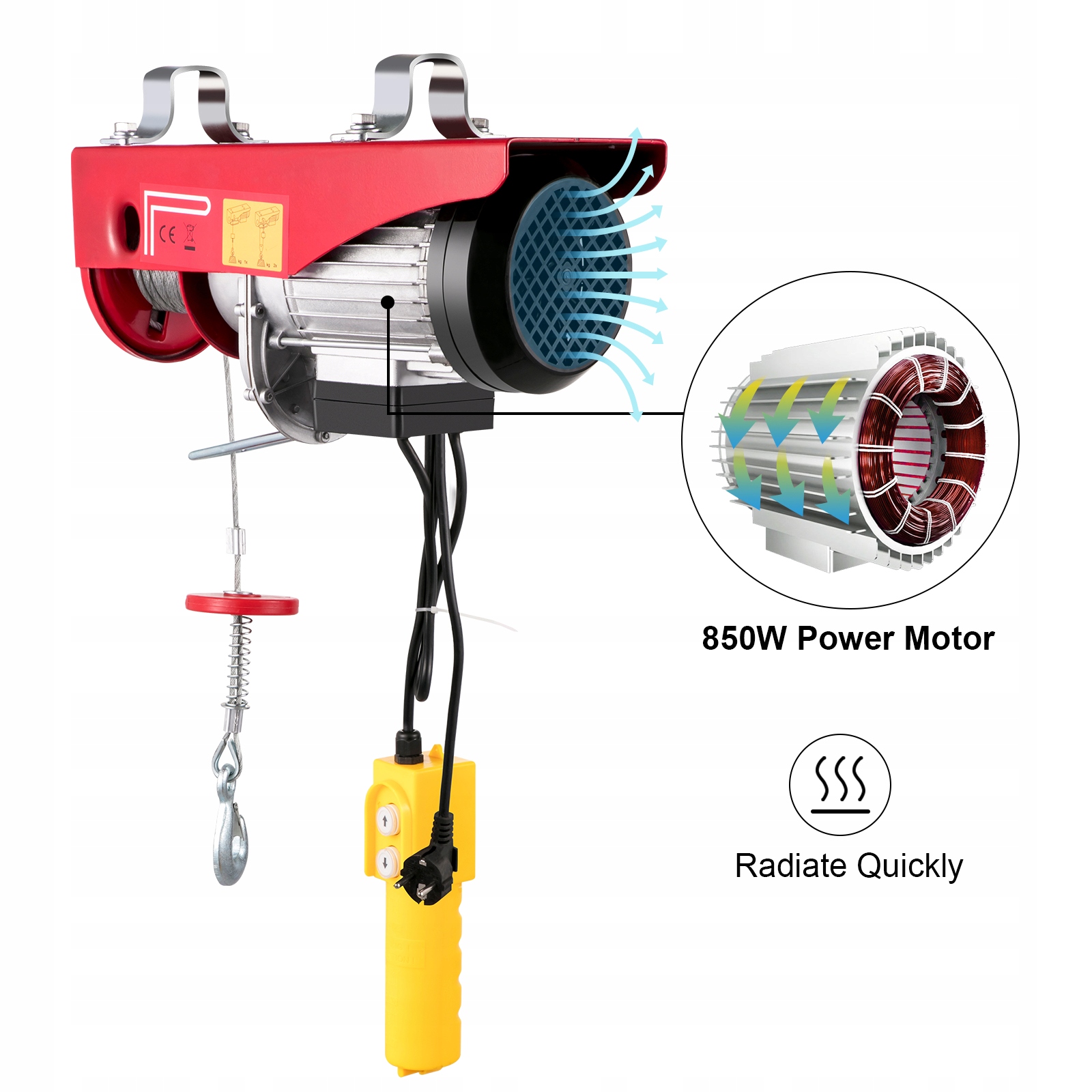 Електрична лебідка використовує двигун із чистої міді потужністю 850 Вт, що забезпечує високу ефективність і низький рівень шуму. Крім того, електрична лебідка може працювати безперервно протягом тривалого часу, оскільки вона швидко випромінює.