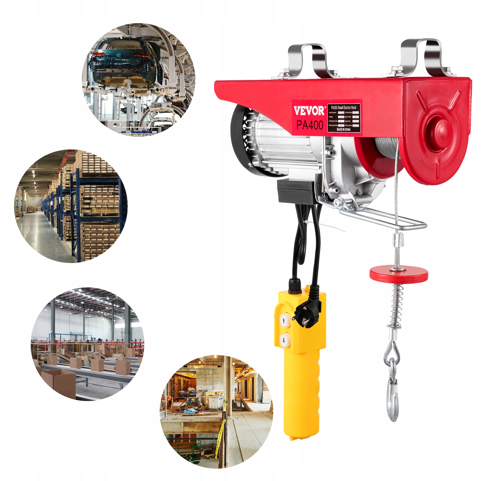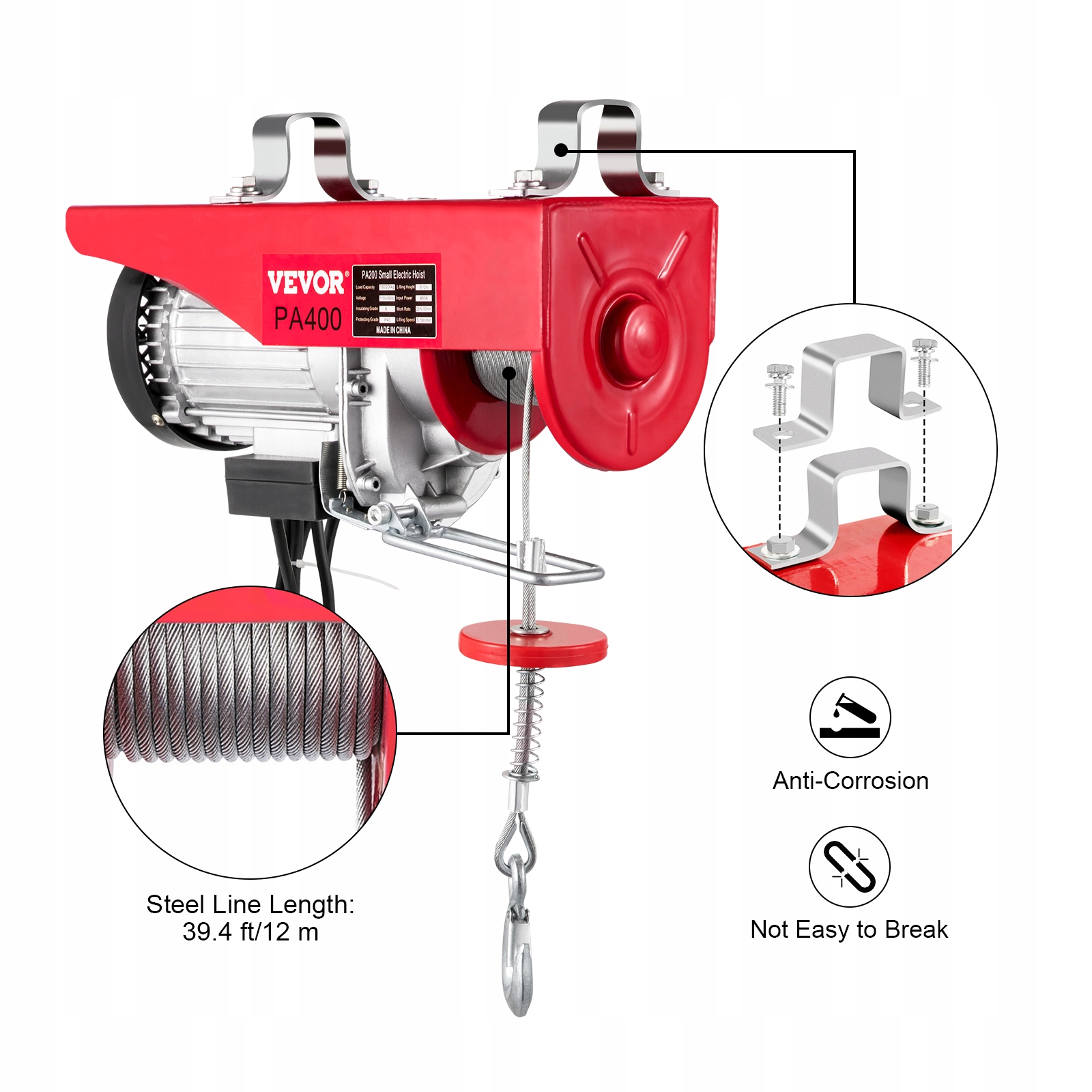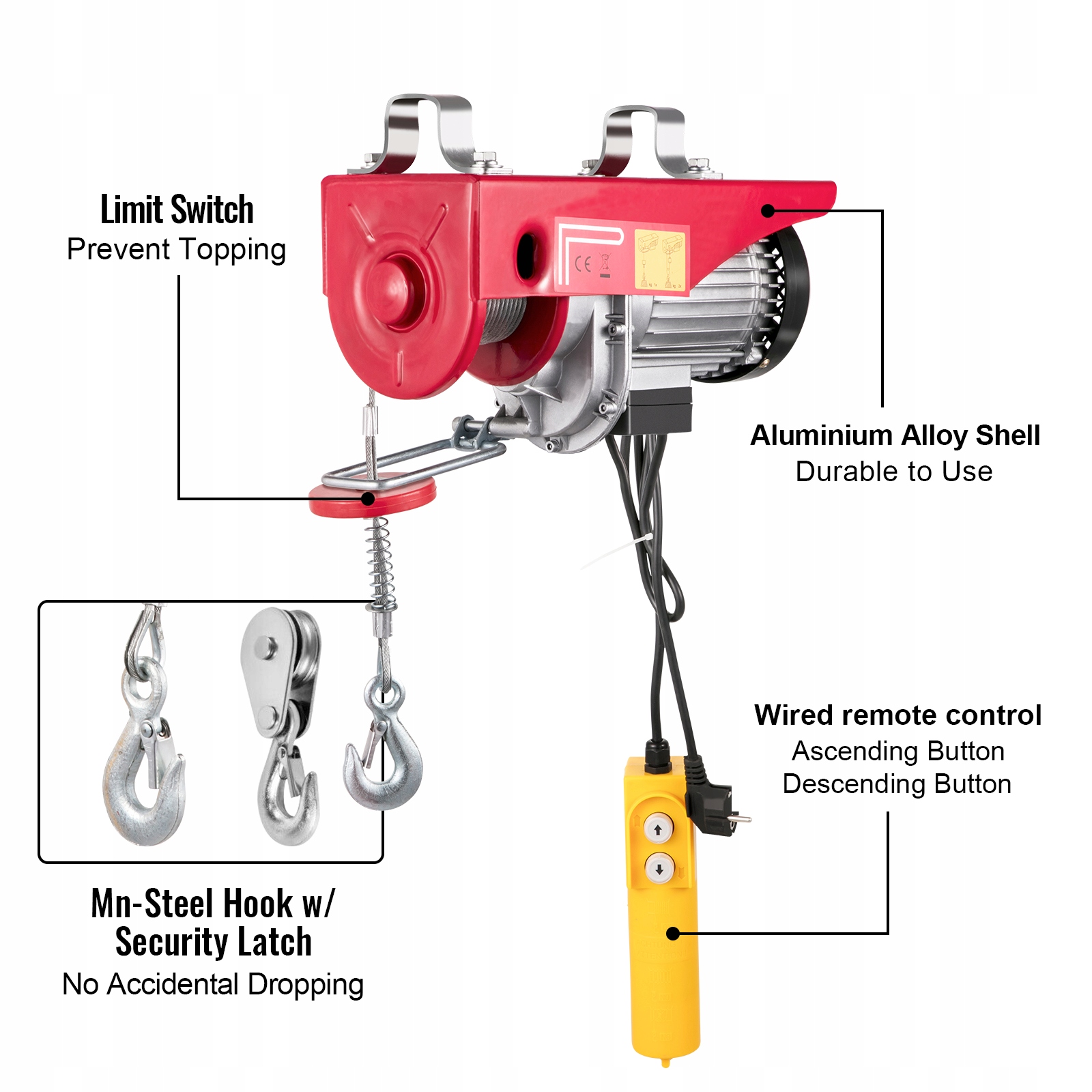 Цей електричний підйомник призначений для підйому та переміщення важких предметів. Сталева конструкція та двигун із чистої міді забезпечують довговічність та високу продуктивність. Підйомник можна використовувати з однією лінією вантажопідйомністю 440 фунтів/200 кг або з подвійною лінією вантажопідйомністю 880 фунтів/400 кг. Це ідеальний інструмент для транспортування на заводах, доках, складах, вантажних кранах, будівельних майданчиках та в інших місцях.