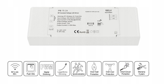 Світлодіодний блок живлення 24 В 75 Вт 3,125 А з регулюванням яскравості 2,4 ГГц / Push-Dim