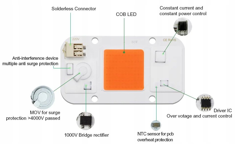 LED COB 50W 230V 75 X 40 ТЕПЛИЙ БІЛИЙ КОЛІР 3000K + ПАСТА