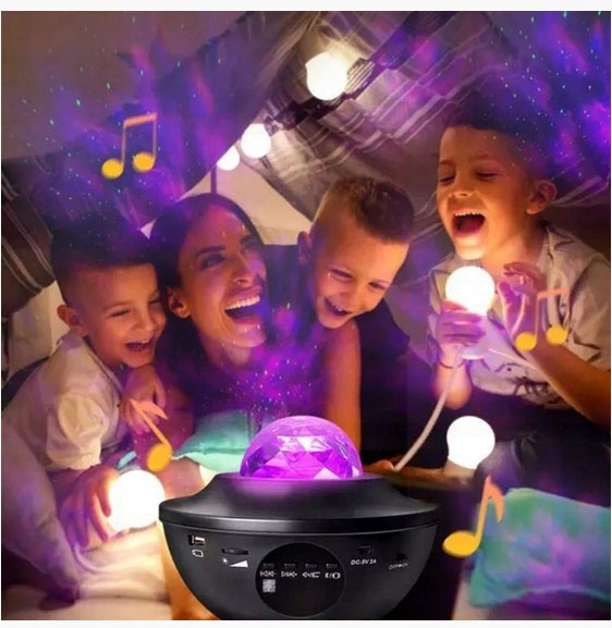 Пристрій вражає дивовижними проекціями всіх кольорів веселки, але не тільки це, він також має високоякісну звукову систему.Виріб має вбудований гучномовець і відтворює музику з зовнішні диски за допомогоюроз’єму USB. b> або через Bluetooth з мобільного пристрою.