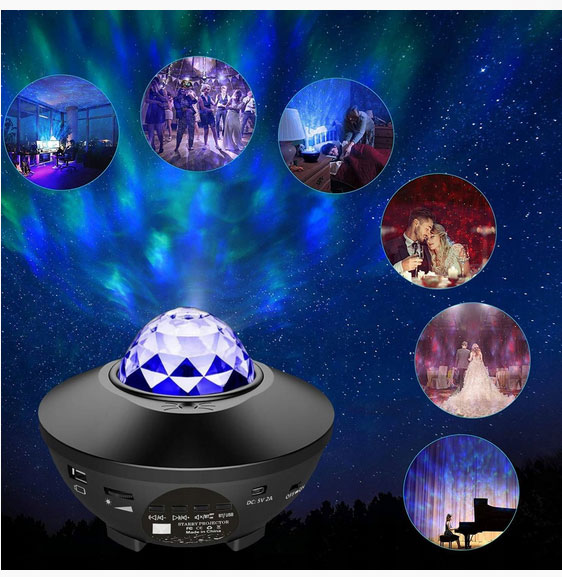 Пристрій може імітувати проекцію барвистої заспокійливої галактики чи океанських хвиль. Крім того, він може випромінювати лазерні промені та комбінувати різні ефекти в 4 кольорах: червоний, зелений, синій і білий.