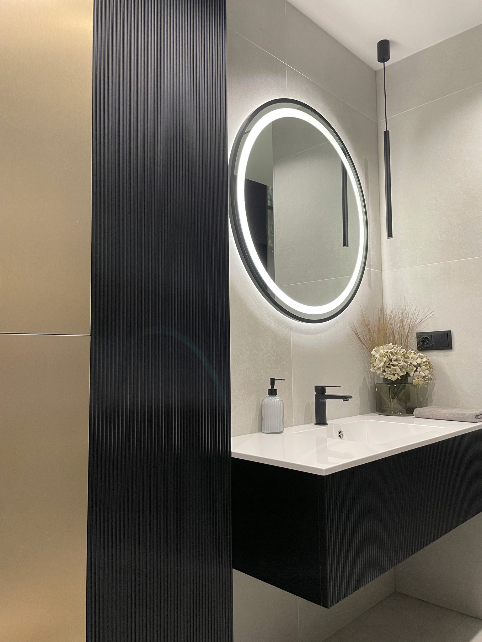 Дзеркало в чорнійделікатнійрамі зі світлодіодним підсвічуваннямбуде ідеальним доповнюють мінімалістичний чи класичний стиль кімнати та композиції, натхненні лофтом чи індустріальним стилем.