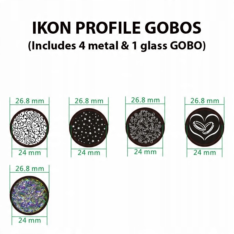 Профіль Ikon має текстурований скляний гобо. Завдяки зручному доступу користувач може швидко замінити візерунки гобо на власні. Проектор поставляється з 3 змінними об'єктивами з різними кутами огляду (15-30 градусів), що робить пристрій більш універсальним.