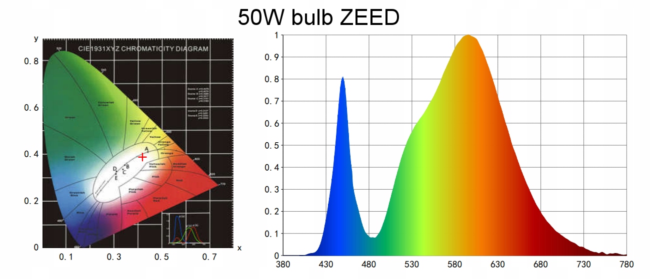 Завдяки природному кольору лампочка не втомлює очі і може використовуватися в кімнатах, де люди. з широким діапазоном довжини хвилі. Один діод поєднує в собі світло: білий, червоний, синій, ІЧ та УФ -діод.