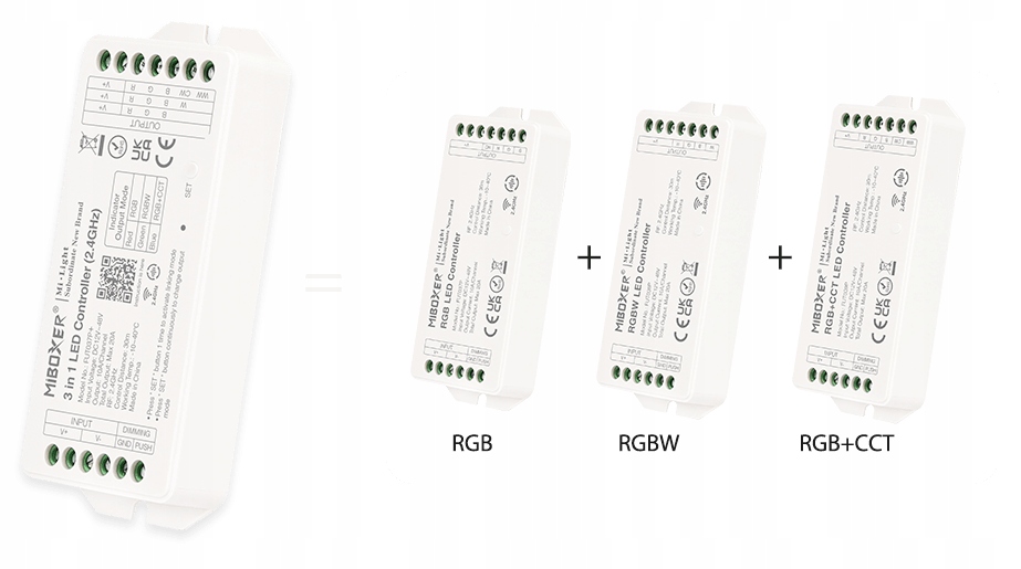 Світлодіодний радіоприймач 3 в 1 RGB/RGB+W/RGB+CCT - 12-48 В постійного струму 20 A Mi-Light, це невеликий пристрій, який використовується для керування різнокольоровим світлодіодним освітленням. Пристрій розроблено таким чином, що дозволяє змінювати інтенсивність яскравості, колірну температуру CCT або колір RGB за допомогою відповідного світлодіодного контролера та вибору відповідного режиму роботи між багатоколірною установкою RGB, багатоколірною установкою з додатковий білий колір RGB + W або багатоколірна установка зі змінною колірною температурою RGB + CCT. Зв'язок такого пристрою здійснюється через радіо, за допомогою якого приймач зв'язується з передавальним пристроєм. Доступ до приймача також можна отримати через WiFi і голосові системи Amazon Alexa або Google Home за допомогою відповідного модуля. Цей приймач працює з пристроями серії Mi-light.