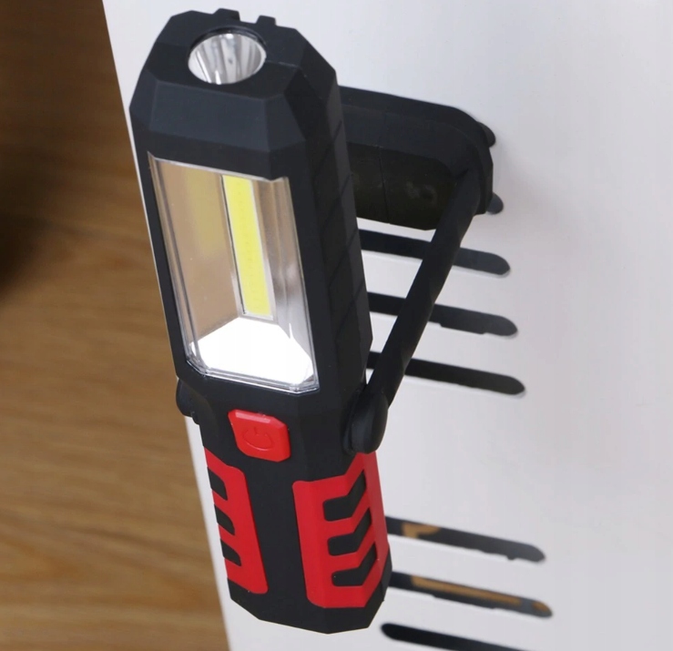 Ліхтарик для майстерні має магнітний тримач, який дозволяє легко прикріпити його до металевих поверхонь. Не менш практичним є вбудований гачок, який дозволяє легко повісити лампу в будь-якому обраному місці. Можливість різноманітних інсталяцій полегшує роботу та підвищує оглядовість.