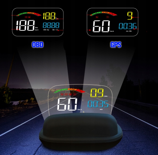 HUD скорочення від Head Up Display. Відображає дані про водіння на лобовому склі автомобіля, такі як швидкість, оберти, температура води, відстань у дорозі тощо; Уникайте небезпечних водіїв завдяки перегляду приладу під час водіння. Водії можуть миттєво зчитувати інформацію про водіння та завжди підтримувати найкращий стан на дорозі за допомогою HUD.